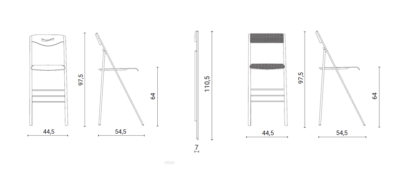 Sgabello pieghevole con struttura in metallo, seduta e schienale in vitrex, legno o lamiera forata