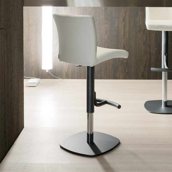 Sgabello con alzata a gas, basamento in metallo e seduta rivestita in pelle o eco pelle nabuk.
