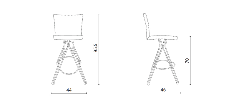 Sgabello fisso con basamento in filo metallico e seduta rivestita in pelle o eco pelle nabuk.