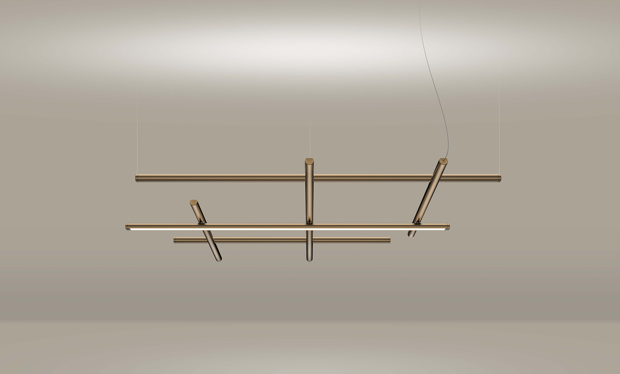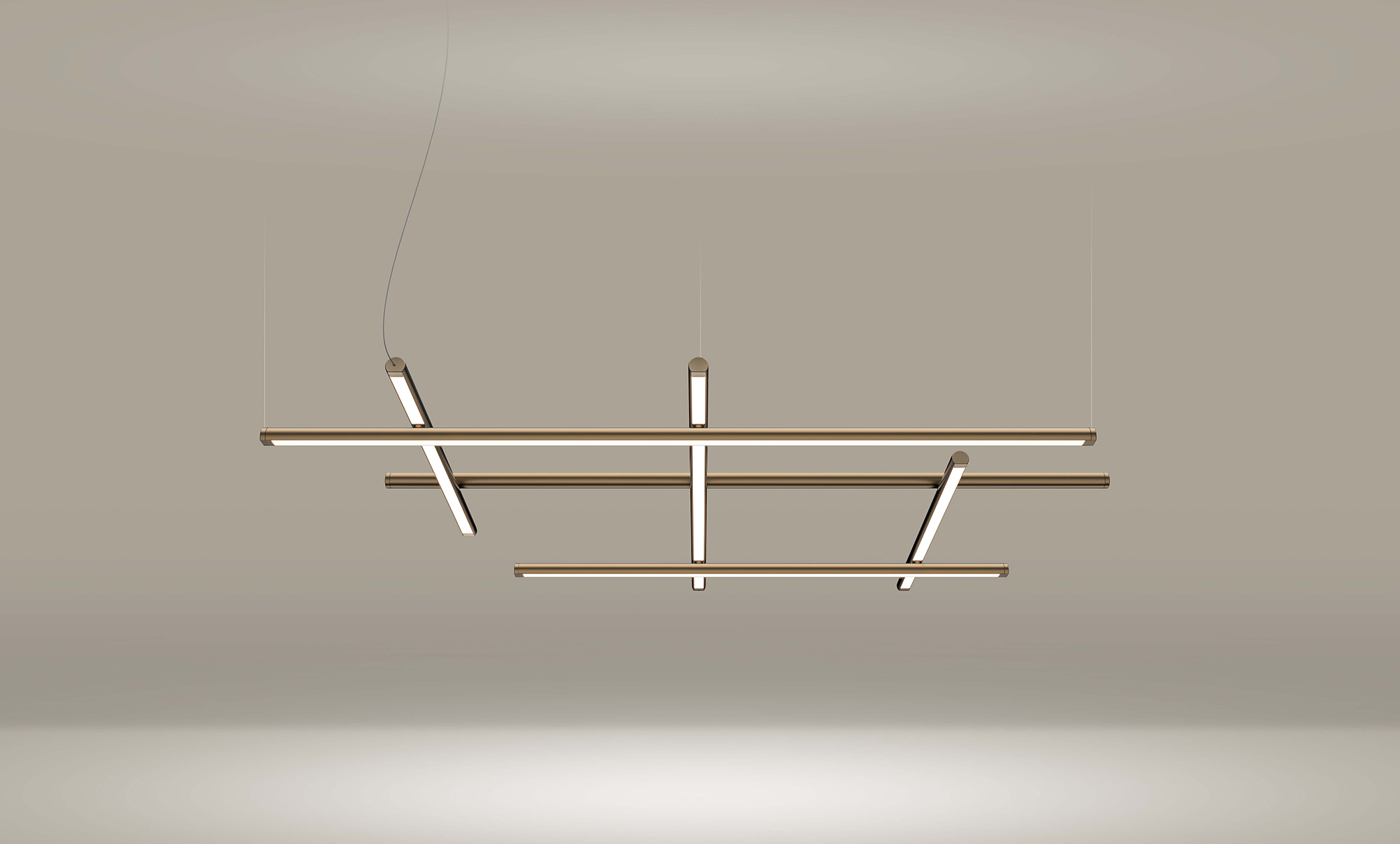 Un corpo illuminante costituito dalla combinazione di elementi lineari trasversali e longitudinali, in grado di caratterizzare con le sue infinite possibilità compositive la scenografia di ogni ambiente. Le numerose varianti consentono un’installazione libera e intuitiva sia a sospensione che a soffitto o parete. La doppia emissione costituisce un ulteriore fattore di versatilità: nella versione a sospensione infatti è possibile invertire l’orientamento delle funi, permettendo l’installazione del prodotto su entrambe le facce per una maggiore illuminazione diretta o indiretta. I modelli a sospensione sono inoltre abbinabili agli articoli To-Be 22, per uno sviluppo tridimensionale delle composizioni. Disponibile nelle finiture bianco, nero satinato, bronzo, ottone satinato e titanio, con diffusori opalini o neri.