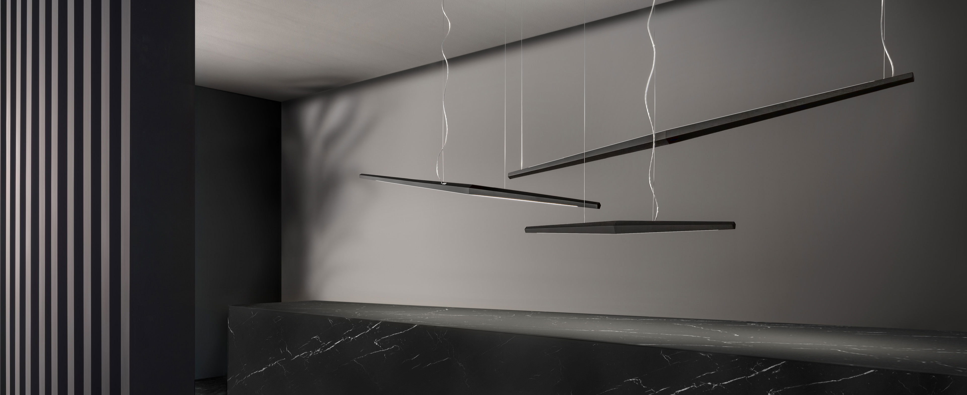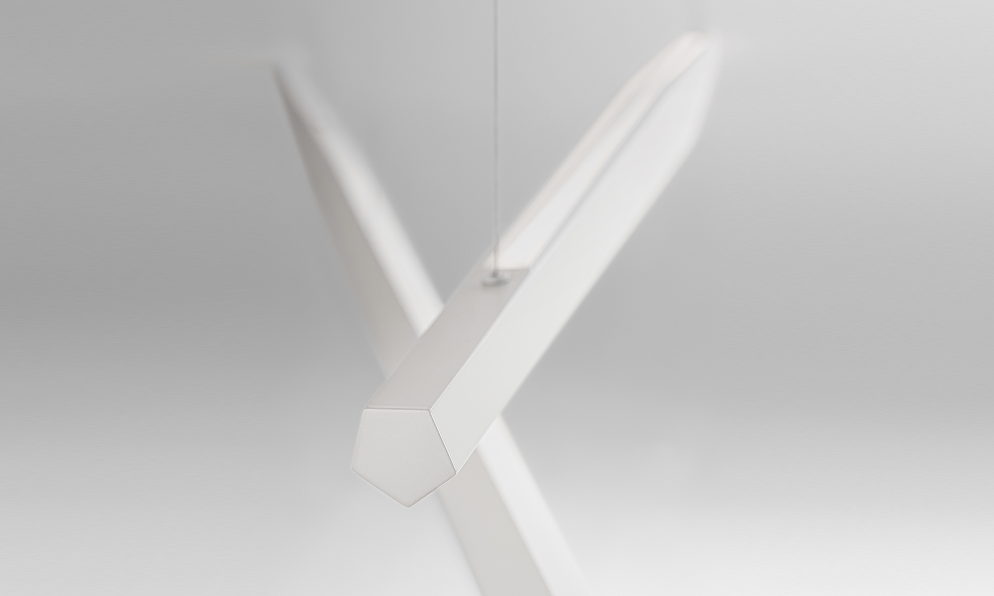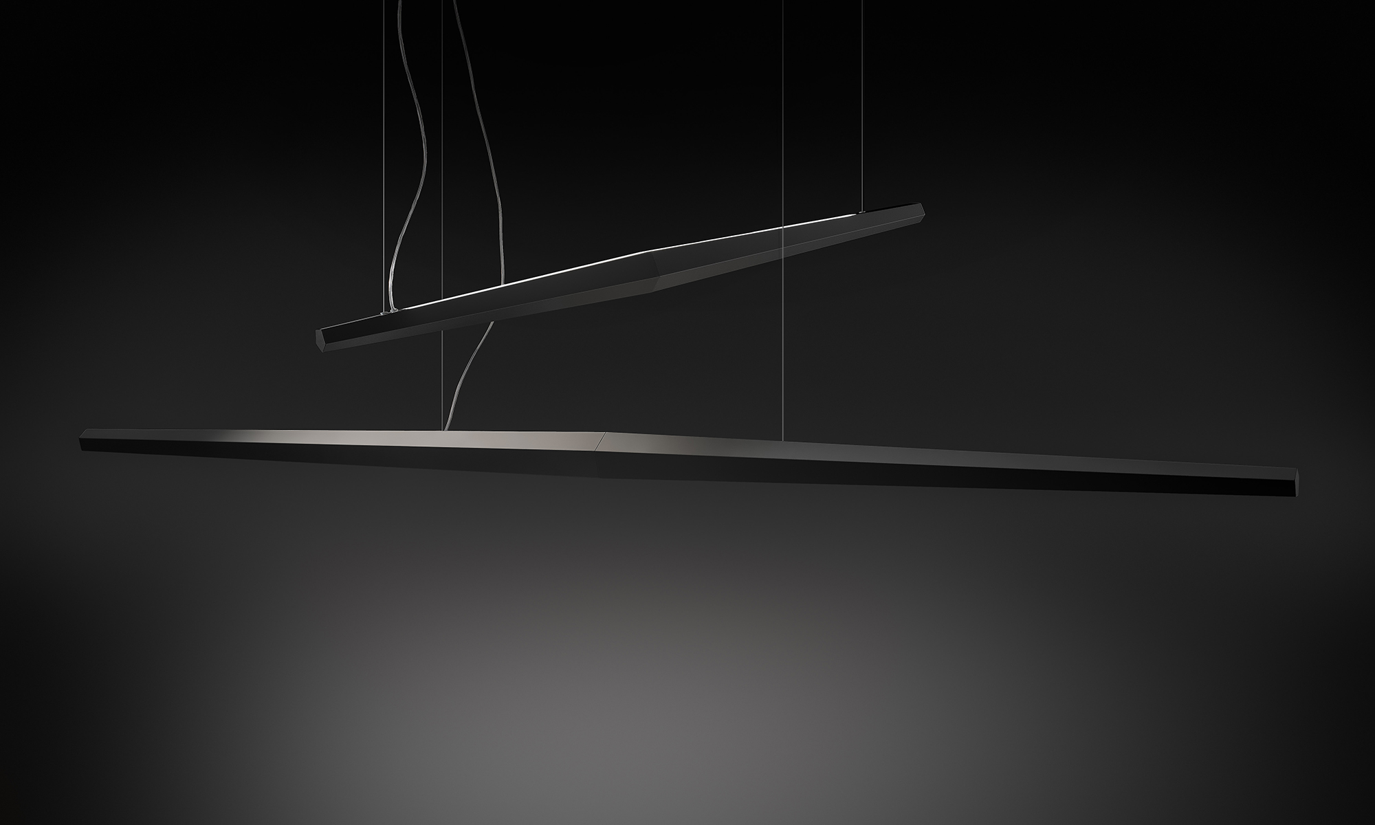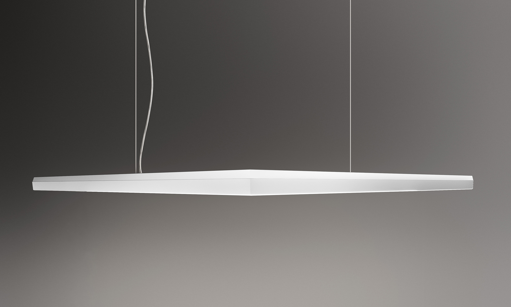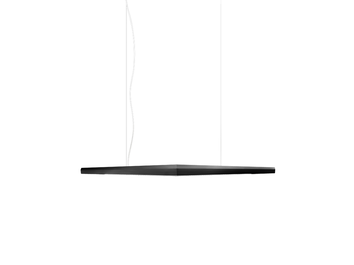Lampada a sospensione e da terra con sezione pentagonale in alluminio piegato e inciso. Sorgente luminosa composta da modulo LED e dimmerazione di serie DALI/Push DIM integrata nel corpo della lampada tramite driver ultra-flat di ultima generazione. Versione a sospensione disponibile in due lunghezze (120 e 210cm) a luce diretta. Disponibile versione a sospensione a luce indiretta, ideale per creare composizioni in combinazione con la versione a luce diretta. Disponibile versione da terra con base realizzata in metallo tagliato a laser, piegato, e verniciato. Finitura con vernice poliacrilica in bianco o nero. Ideale per uffici, zone living, e in composizione per arredare grandi spazi.