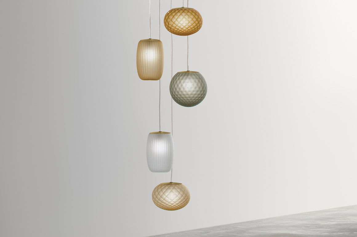 Lampade a sospensione in vetro soffiato satinato, caratterizzate dal trattamento del vetro secondo le tecniche rigadin, balloton, e ballotondo che conferiscono rispettivamente ad Ely una finitura rigata, ad Emy una trama romboidale e ad Evy un pattern sferico. Rosone in metallo rifinito con vernice poliacrilica in ottone satinato. Emissione di luce diffusa con attacco G9 per lampada LED retrofit disponibile a catalogo da ordinare separatamente. Cristallo, acciaio, ambra, bronzo, tabacco e verde le colorazioni vetro disponibili. Cavo elettrico trasparente. Disponibile rosone a scomparsa e rosoni per sospensioni multiple.