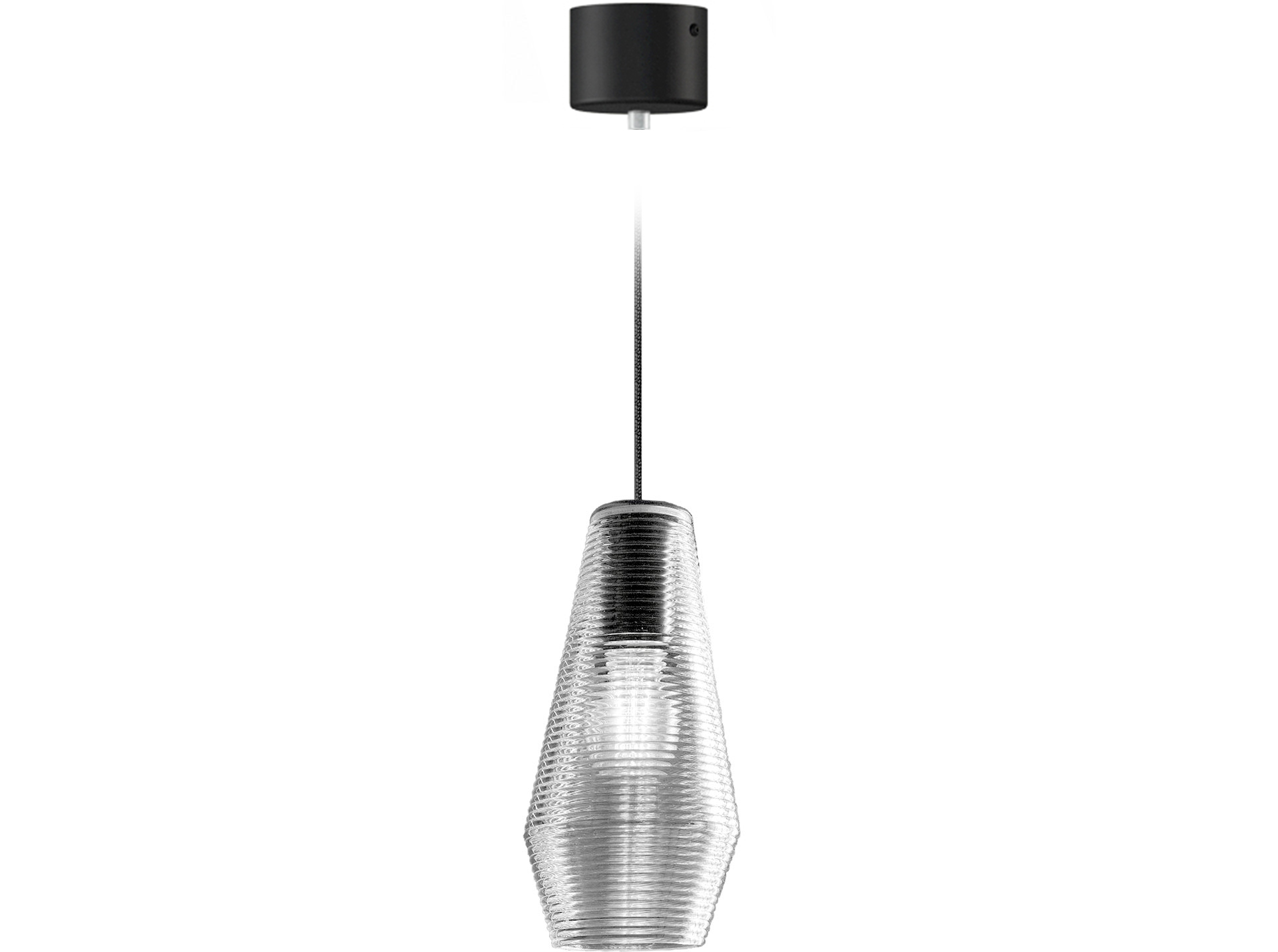 Lampada a sospensione in vetro soffiato con particolare finitura a coste dal gusto retrò. Rosone in metallo rifinito con vernice poliacrilica in color nero o nella nuova versione ottone satinato. Emissione di luce diffusa con attacco E27 e lampadina LED con filamenti a vista inclusa. Vetro soffiato disponibile in 7 colorazioni: cristallo, acciaio, ambra, bronzo, tabacco, verde e bianco lucido. Cavi elettrici in tessuto nero con possibilità di personalizzarne la lunghezza. Rosone a 8 uscite (+1 centrale). Ideale per strutture hospitality o zone living residenziali.