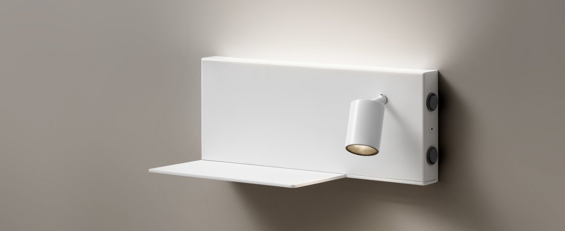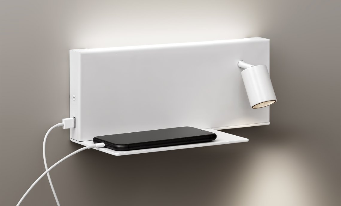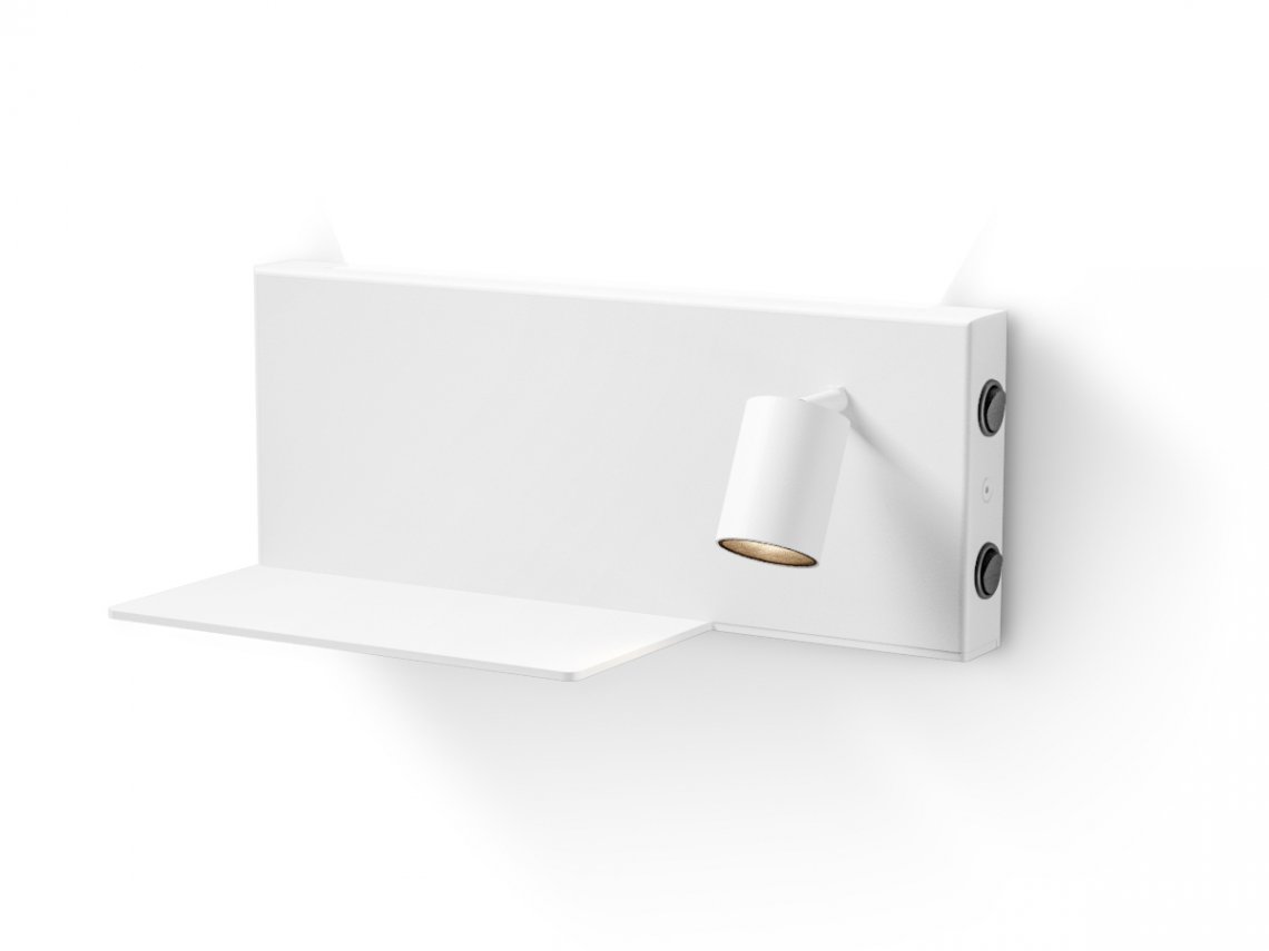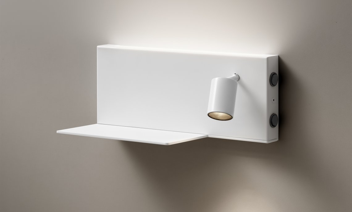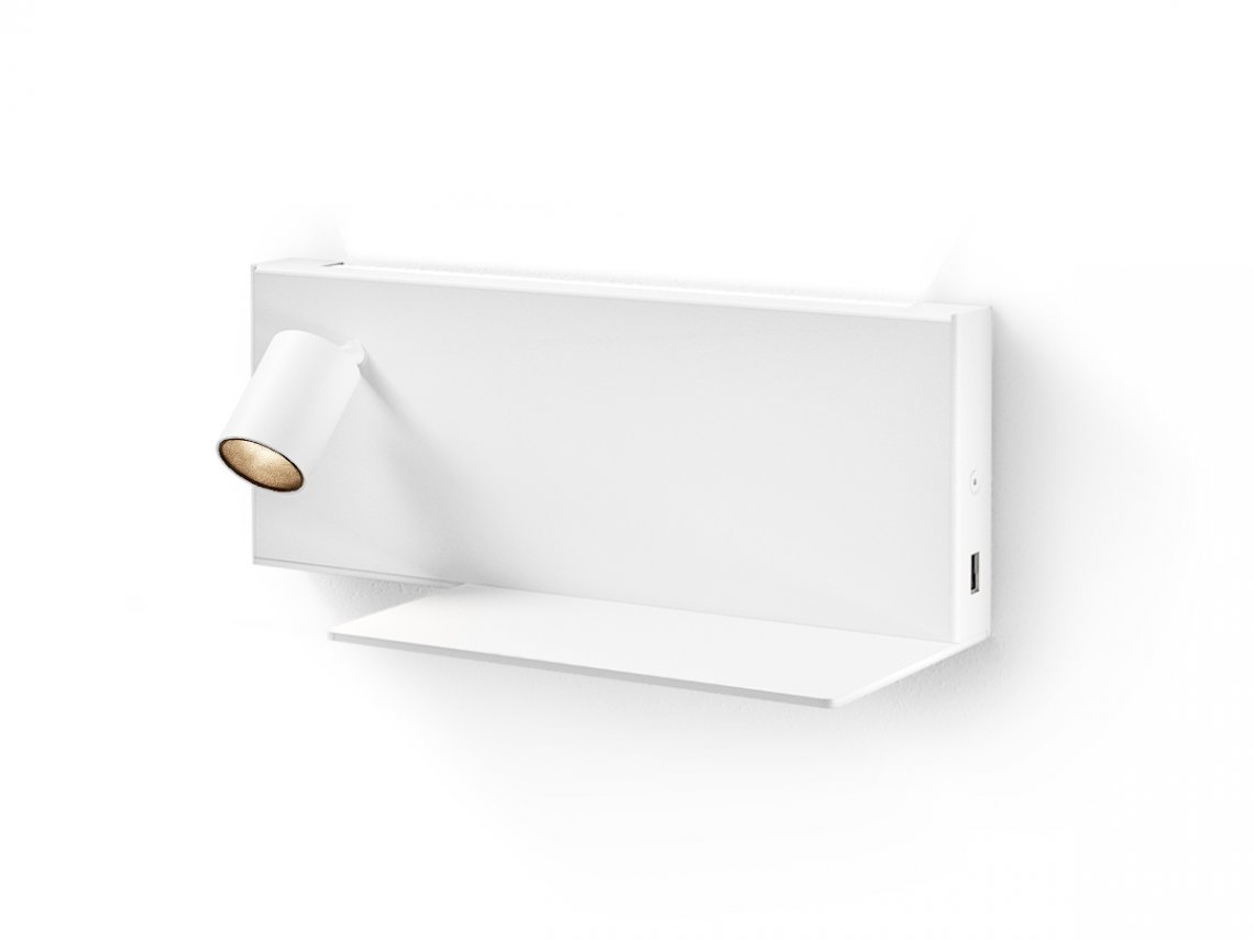 Wall mount fitting for bedrooms with indirect diffused light and adjustable reading light, in warm white. Available in two mirrored version for positioning on left-hand side and right-hand side of the bed, it showcases a shelf with a USB power outlet for charging batteries of electronic devices such as smartphones. Supplied with integrated ON-OFF drivers, it showcases a double switch for separate control of the courtesy light and the reading light. Available in finishes white, black, bronze, mat brass, titanium.