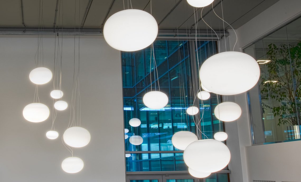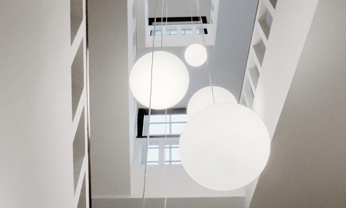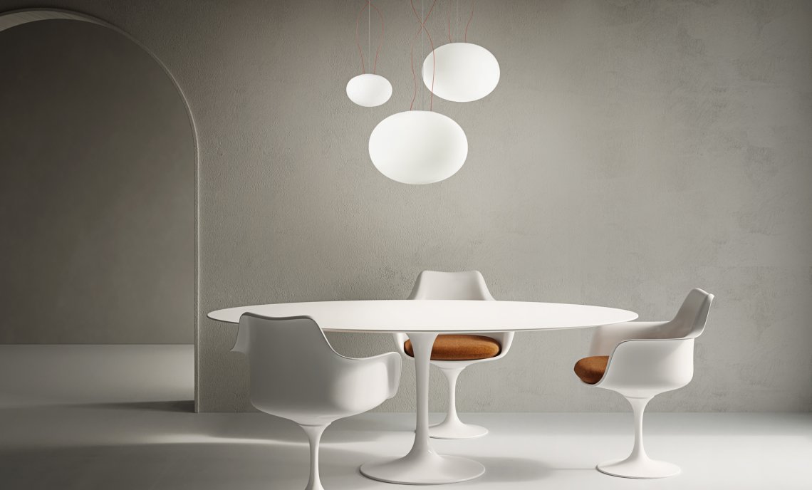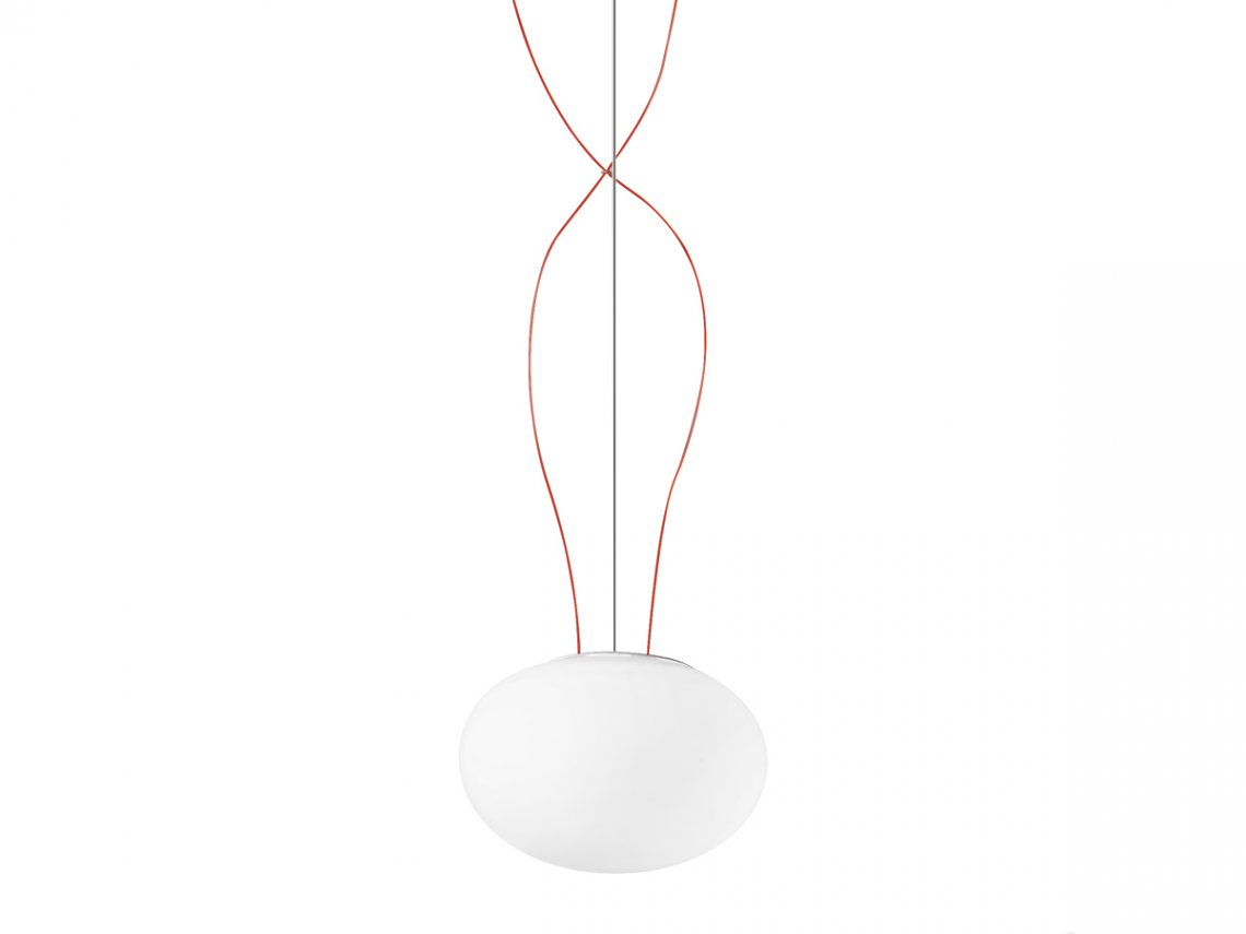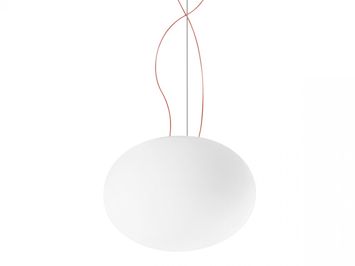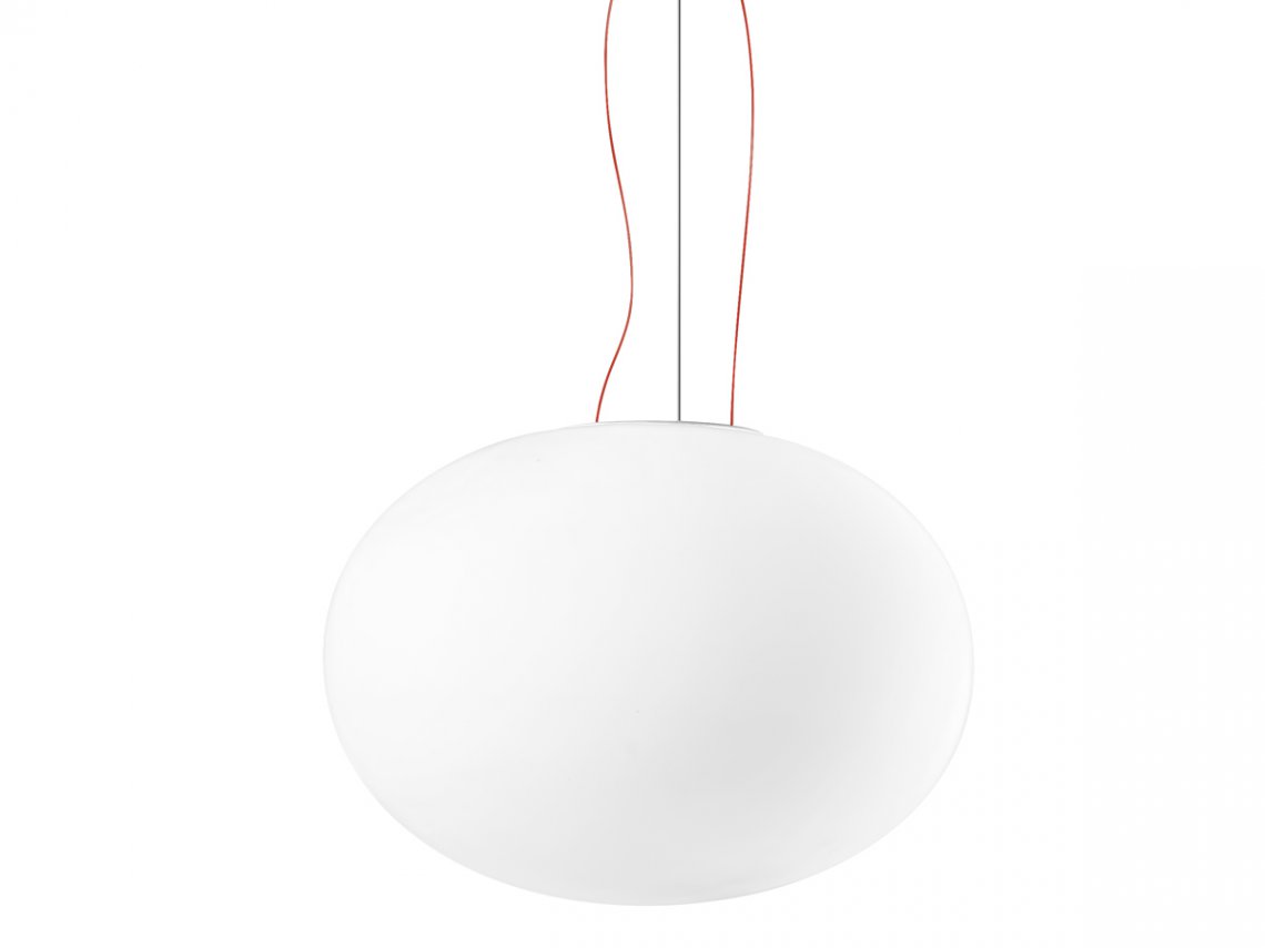 Suspension, table and ceiling lamps in blown opal glass. Metal frame in white polyacrilyc paint. Diffused light provided by different light sources (LED, G9, E27). Perfect and homogeneous distribution of the light, without any shadow. Ideal for residential use or for lobby areas in multiple compositions.