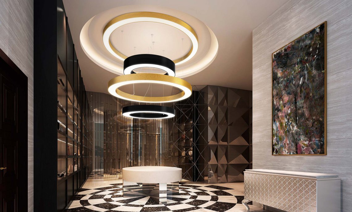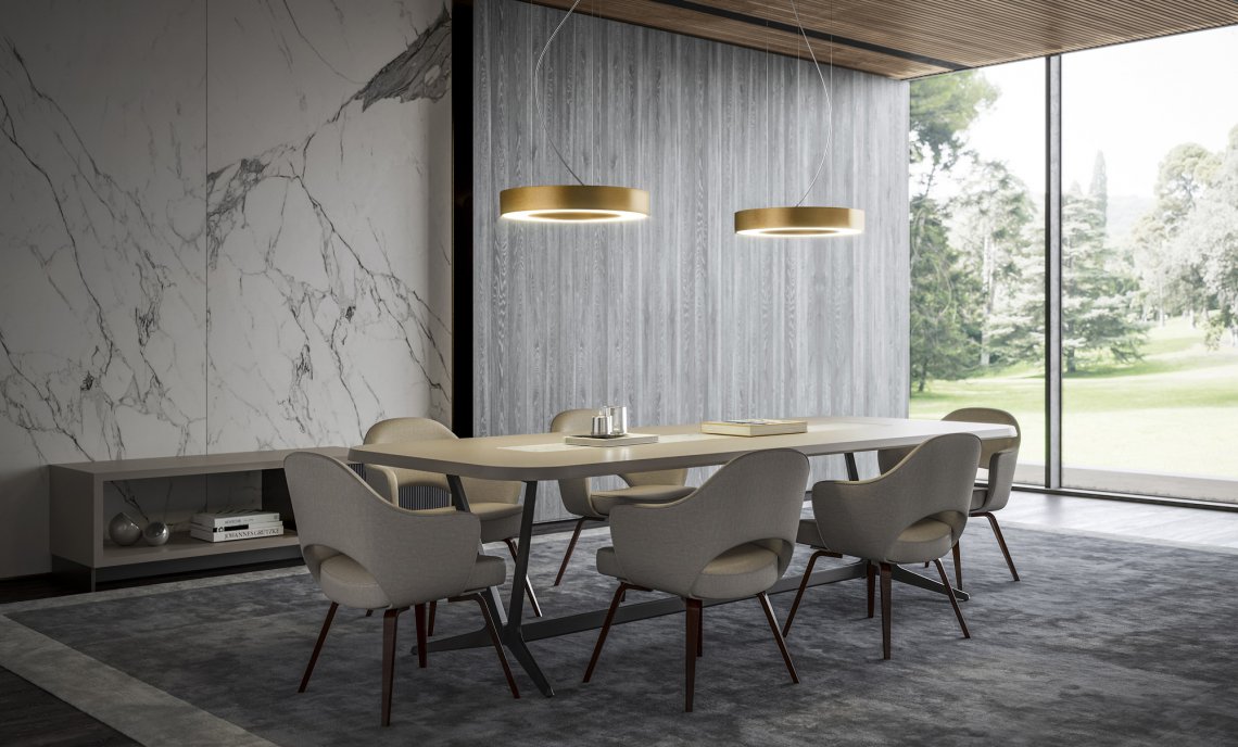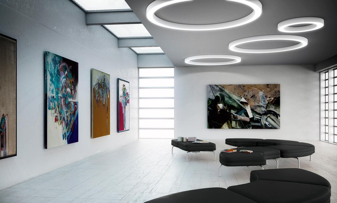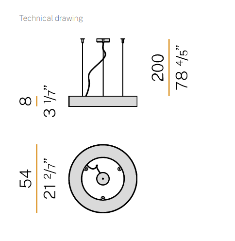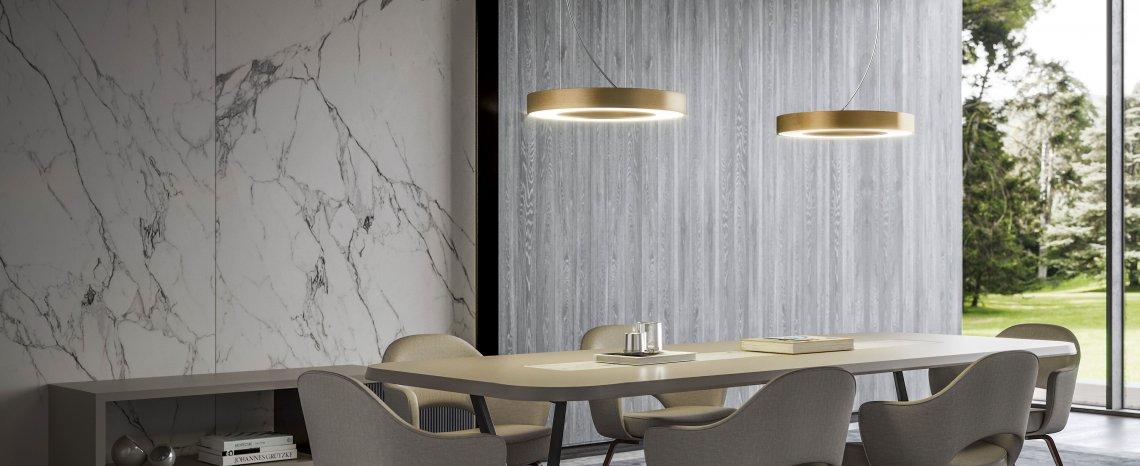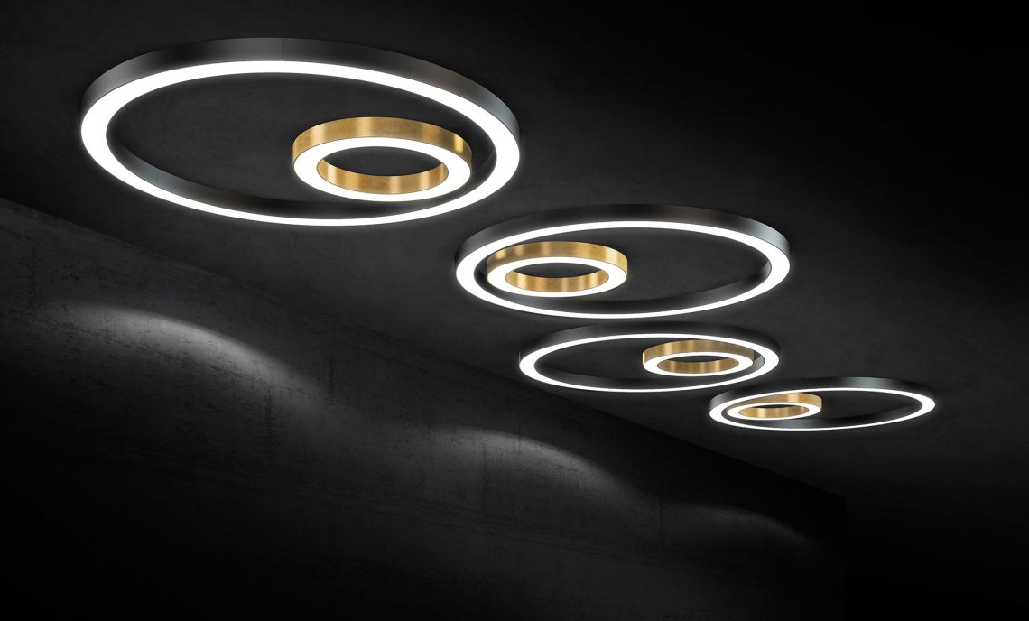 Aluminium ring with bottom high-transmittance screen in opal polycarbonate. Available in wall/ceiling and suspension versions. Emission of direct light provided by LED module with technology DALI/Push DIM on all versions. Ring eventually finished in polyacrilic paint white, black, bronze or hand-decorated in golden leaf. Custom colors are available on request. Suspended version supplied with 3 steel cable adjustable in lenght (6 cables for 180cm). The wall/ceiling version is supplied with a simplified mounting kit. Ideal for residential use, compositions for offices, hospitality facilities and public spaces. Delivery of the product in a single piece already assembled.
