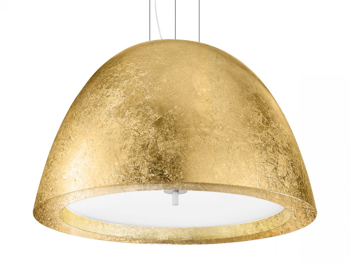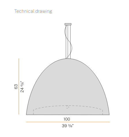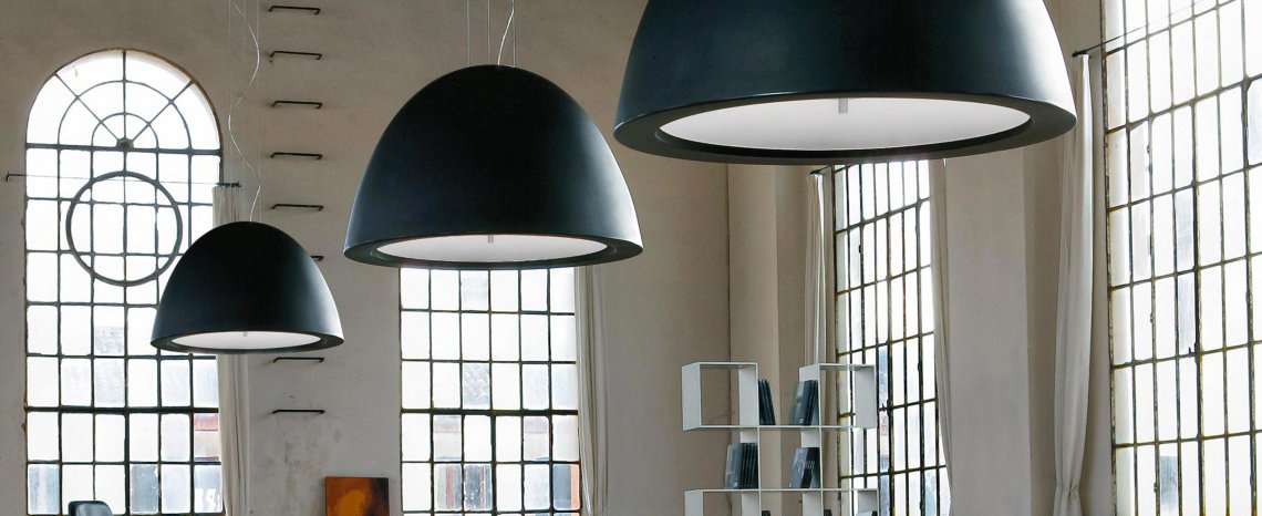 Suspensions in white blown or black painted glass, ? 40cm, ? 50cm and ? 60cm with glass sheet as diffuser. Fittings in metallized grey metal.