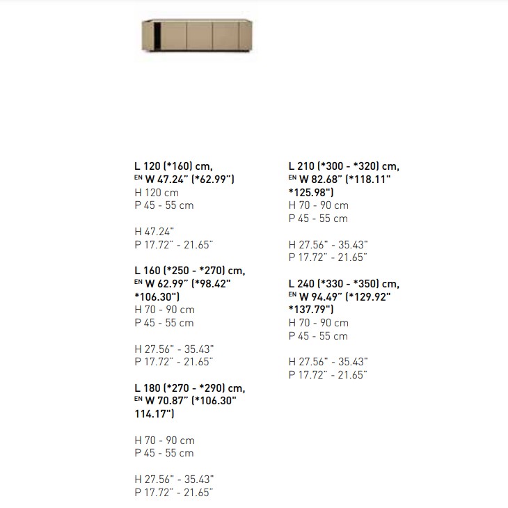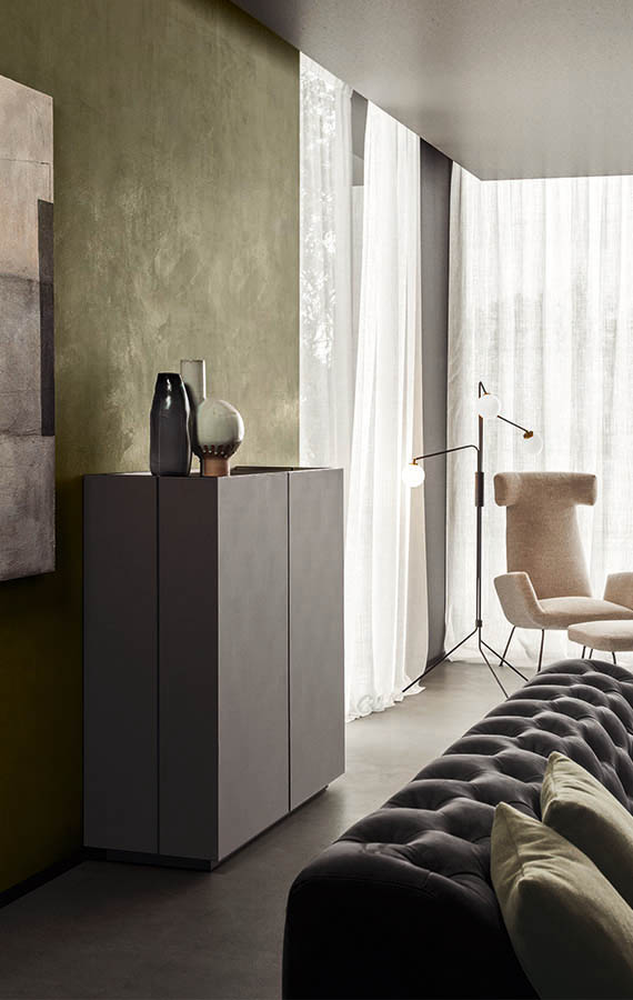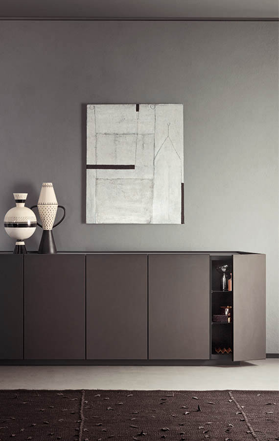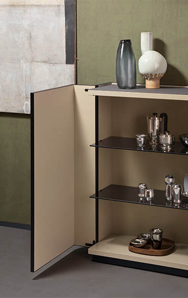 Elegant and sophisticated, the Cornice sideboard borrows its name from the eponymous wardrobe in the Pianca collection, scaling down its salient features to suit its new purpose. The element that gives the unit its character is the frame that runs round the edges of all the panels, punctuating the structure and drawing attention to the run of modules. Just as stylish, but slightly more eccentric, is the hinged lid style opening of the doors on each end, a eature also found on Pianca ‘s new collection of wardrobes. This design detail is sure to make Cornice even more of a statement piece, allowing it to fulfil its destiny and take centre stage in the room rather than be confined just to its closed form. An attractive option is covering the doors and top in synthetic leather.