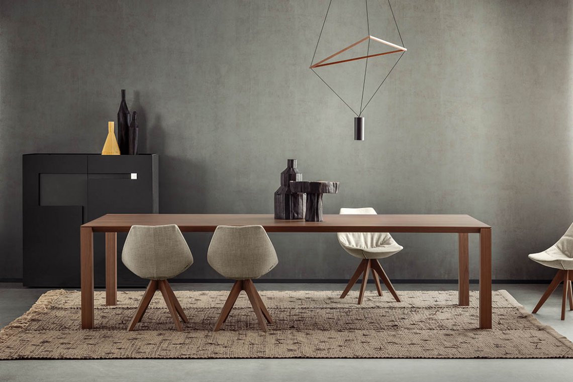 Woody features clean-cut, minimalist geometric shapes and astounding proportions. It can be all of three metres long without needing to be propped up along the way or interrupted. The top is made of a single plank with 45° bevelled edges. The straight, slim, solid wood legs slot into the top following its inclination. Woody’s rigorous, minimalist design can be custom-sized to the centimetre.