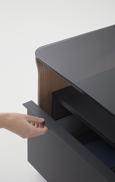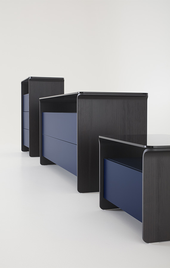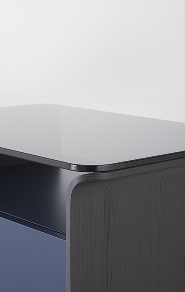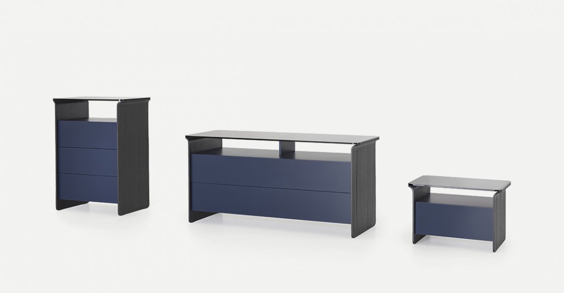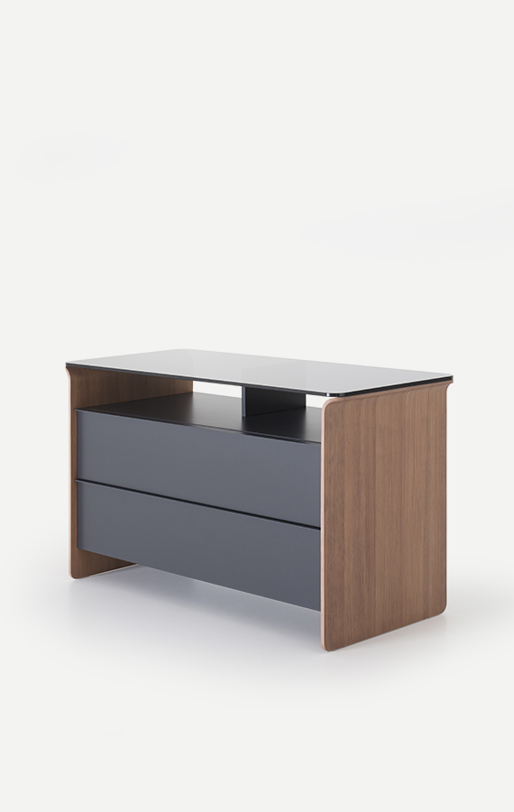 Strength and flexibility, solidity and lightness, simplicity and creativity. Philippe Tabet has designed a collection of casegoods for the bedroom which inhabits the overlap between opposing natures, with distinctively crafted contours and a combination of wood and glass. The top extends over the structure, which curves gently outwards on both sides to support it, like a tray that appears to float. A stylish and functional open shelf detaches from the top of the drawers below. The Nota casegoods are created in plywood, with a Piombo trasparent glass top. The side panels are available in Carbone and Ambra Larice, Borgogna and Canaletto wood, drawers in matt and gloss lacquered finish, in the colours of the collection.