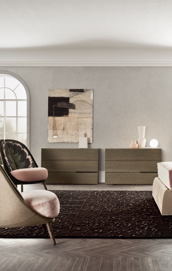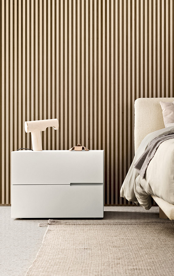 With their subtle design and distinctive details, Segno bedside and drawer units add a fresh, modern accent to any bedroom. Compact, modular arrangements create customised space-saving solutions thanks to the wide range of sizes available. The distinguishing feature of this line is the way the linear handle is carved out of the exceptionally-thick fronts. The aligned handles – that can also mirror each other – produce an interesting alternation of distinctive, horizontal “marks”.