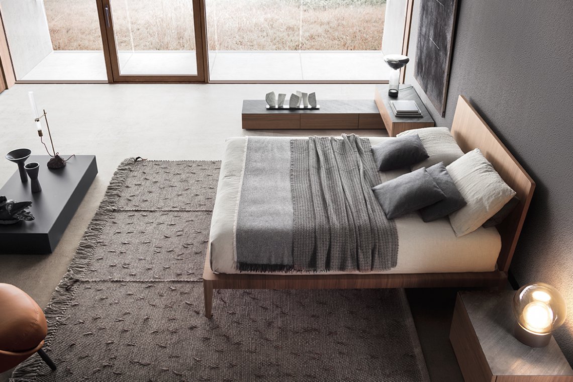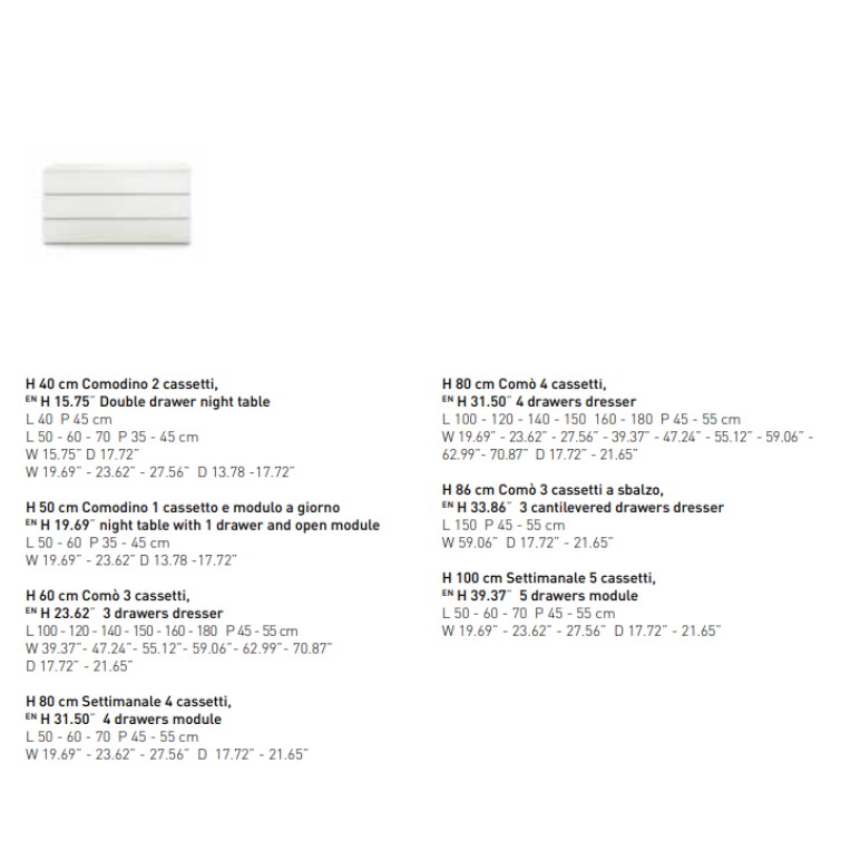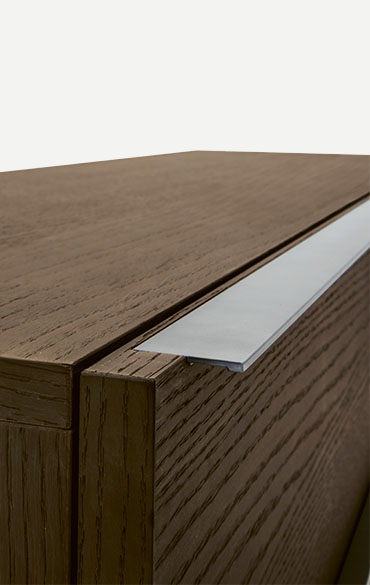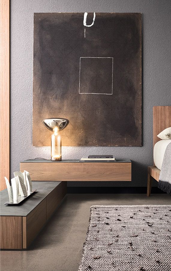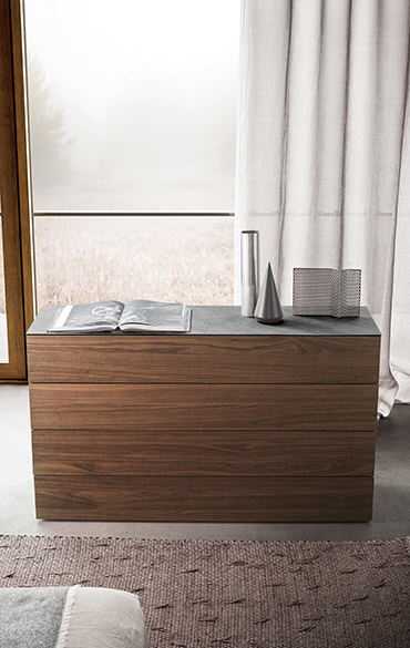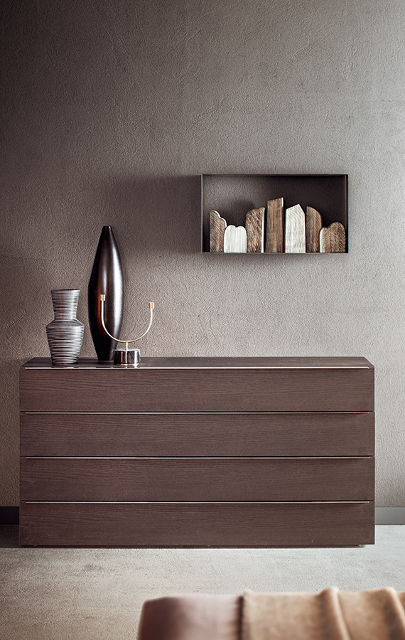 Thanks to its refined, minimalist design Spazio embellishes any bedroom with its versatile, very customisable chests-of-drawers and bedside units. This modular system can create straight or angled solutions by means of simple or complex arrangements. A wide range of finishes is available, especially for the fronts which come in wood, glass, mirror or stone and can have lacquered or textured finishes. They can be opened using the push-to-open mechanism or a chromed or leather, long and slim Lama handle.