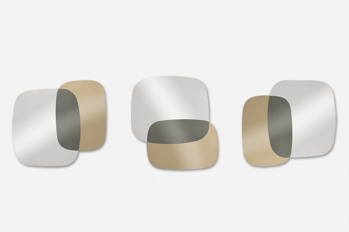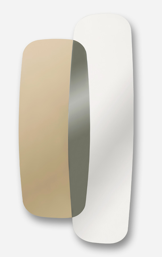 Oltre plays with layering, with the idea of repetition, going beyond, featuring overlapping shapes that are similar in geometry but differ in their proportions. Soft edges, accentuated curves, which heighten the boldness of the design, pursue the harmony of the parts and of the whole. The basic structure is a mirror supported by a black wooden rear panel. The piece is the sum of a dialogue between three mirrors: sylver, smokey and lead metalized. It comes in two sizes, both generous and designed to emphasize its sculptural quality.