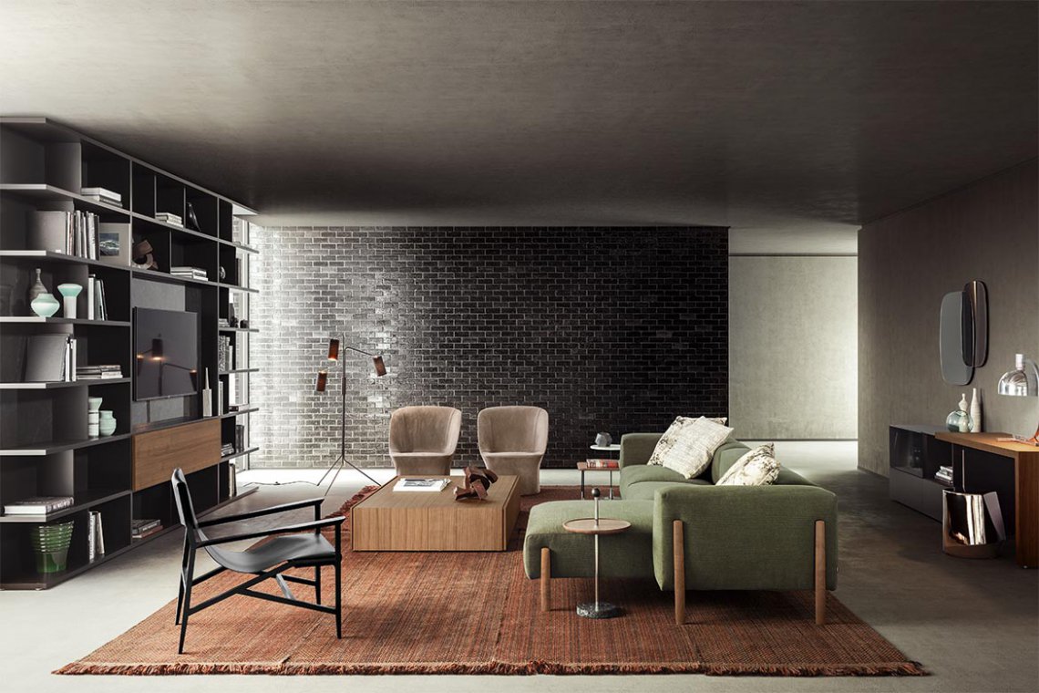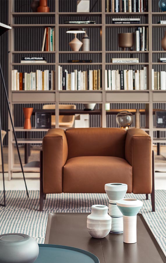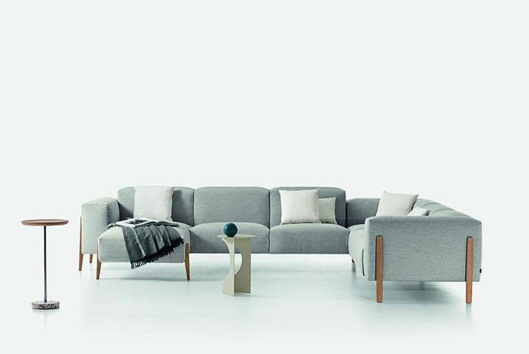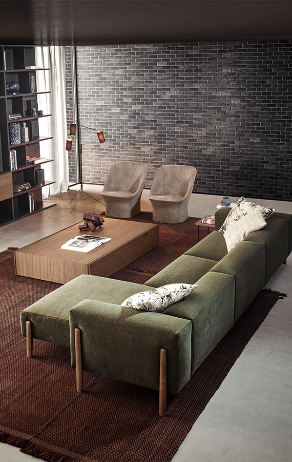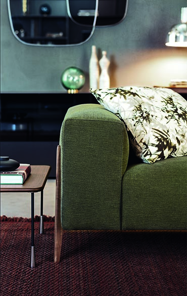 A challenge for gravity: All-in is all about daring design choices. Generous shapes and square volumes communicate with minimalism enhancing lightness and composure. Long legs support a structure raised 18 cm above the floor and run up the sides of this sofa in finishes that can be chosen from any of those available in the collection. The structure is entirely concealed from view by the cushions. Two types of backrest are available and can be used together in mixed arrangements: one flush with the armrests and another taller one.