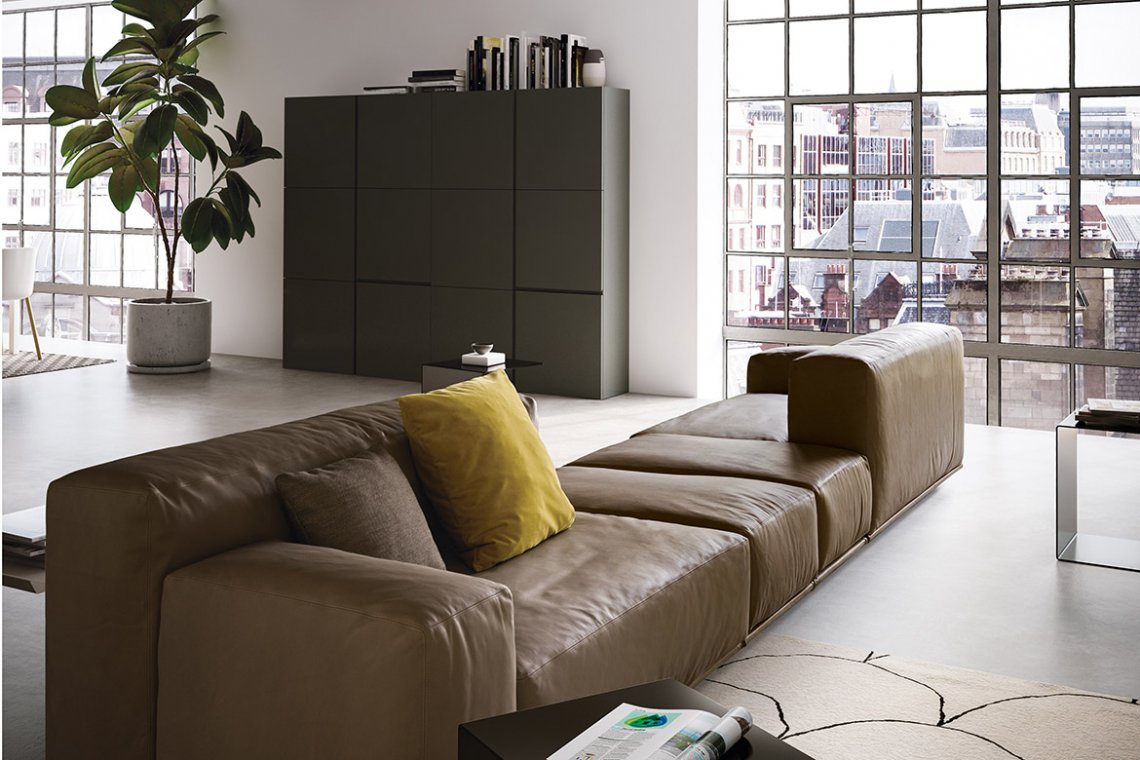 Dive into relaxation: cosy and generous, Delano’s soft, feather-filled seat is irresistible. Inviting and sophisticated, its design looks perfect in the middle of any room. Lots of modular arrangements are available, furnishing spaces in total freedom to utterly enjoy the pleasure of conviviality. There are two different backrest heights as well as two seat cushion depths that can be combined in creative configurations to which low shelving units can be added as armrests. All the volumes stand on covered bases.