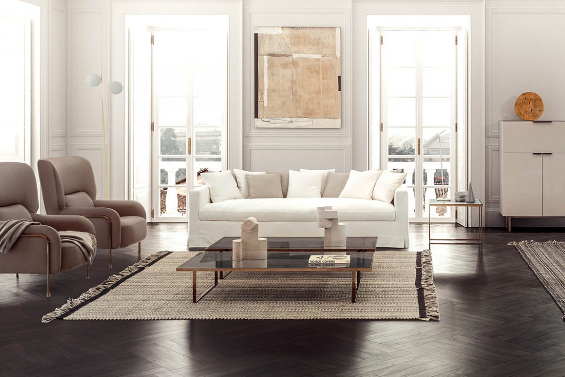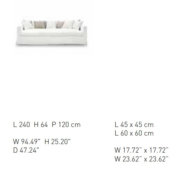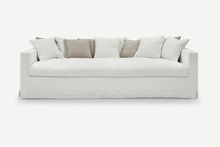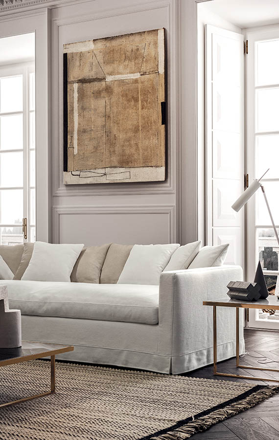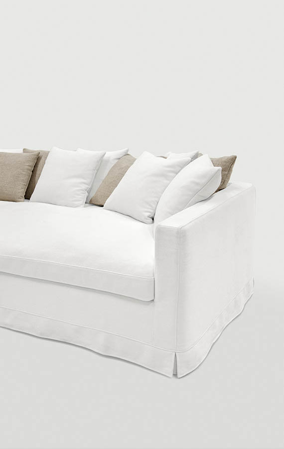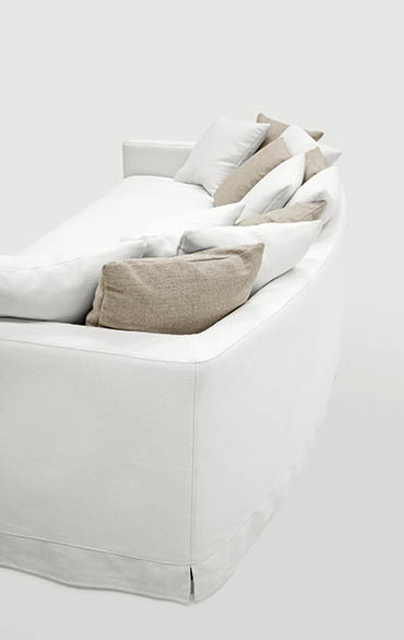 A cosy nest: thanks to its informal style, Otto meets the need for comfort and sharing with its simple, reassuring lines. The single, deep, soft, feather-filled seat cushion invites you to relax and enjoy entertainment with family and friends. The backrest’s curved shape features lots of feather-filled cushions that offer comfy, customisable support. The covering is available in all the collection’s fabric options, is removable and loosens up towards the base.