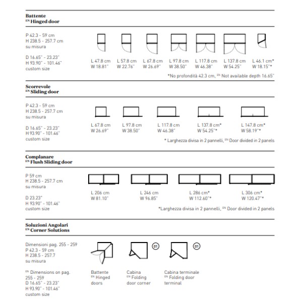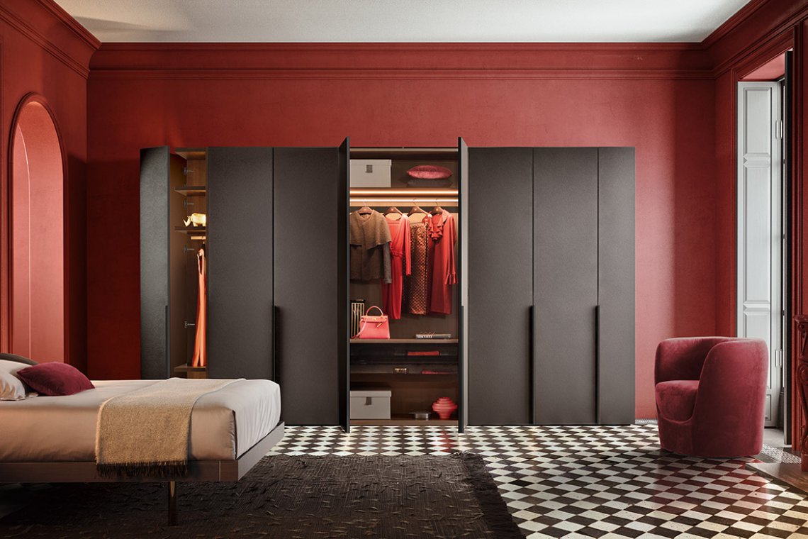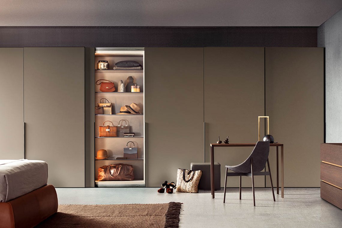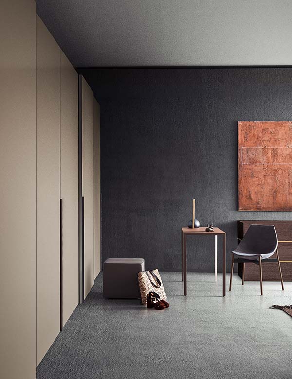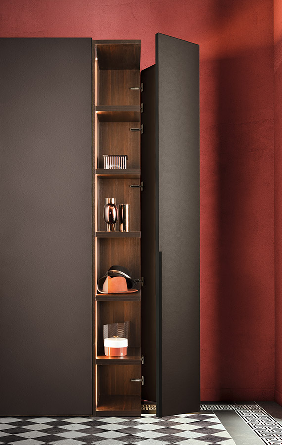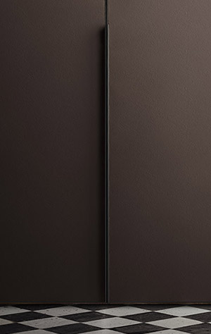The slim, uninterrupted line of the frame draws a discreet and minimal outline. In lacquered or black anodized aluminium, it punctuates the run of vertical modules or tends to blend in when coordinated with the surface finish of the doors available in lacquered glass, mirror, wood and textured finishes as well as man-made leather and matt or gloss lacquers. Long and slightly angled, the handle is designed to form a line that carries on from the frame, giving the door an elegant, linear appeal and offering an excellent grip to any type of hinged, sliding and flush sliding door.