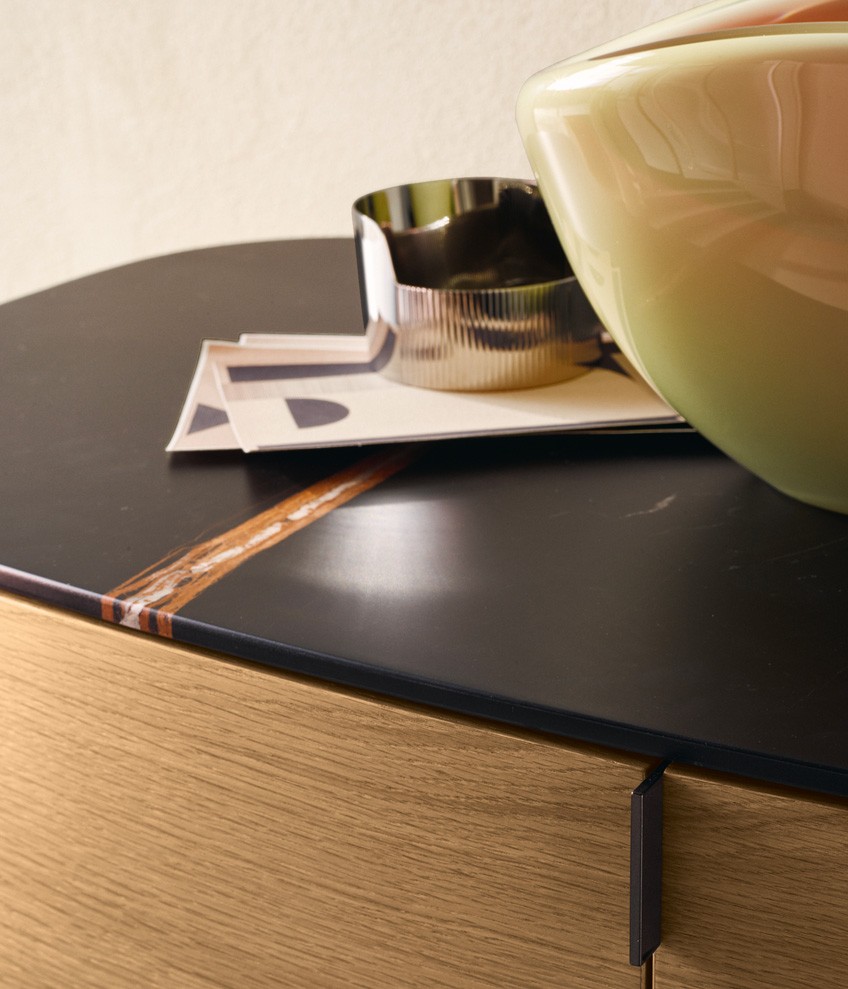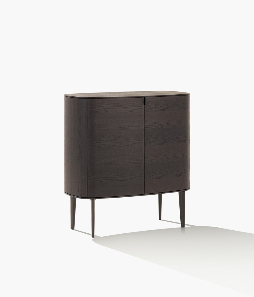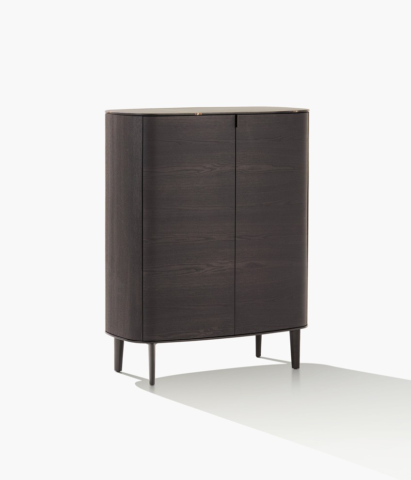 Symphony是一套櫥柜系列,尊貴的材料和精準的工藝體現出了線條之美的精髓。櫥柜以橢圓造型為特色,木飾面更突出了外觀美感。系列產品包含高度和尺寸各異的附件,從高、中款式的柜門,到搭配多個或單個抽屜和開放式隔層的低尺寸款式,均安置在帶支撐腳的底座上。