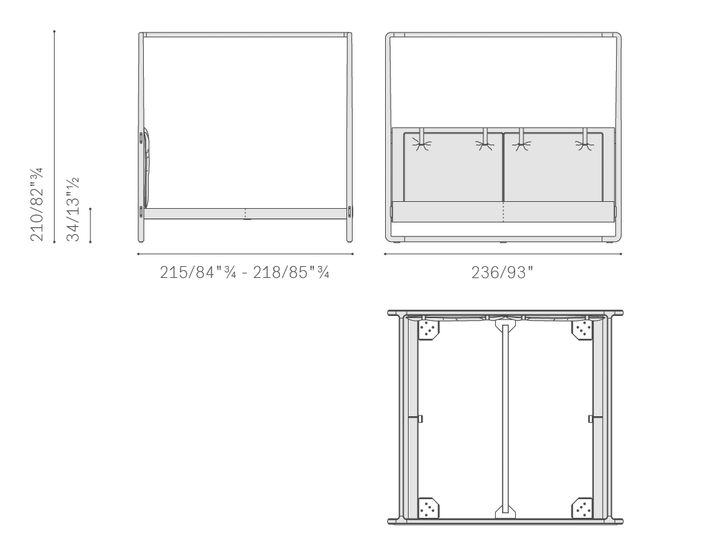 Volare床采用天蓬床結構,使用三角形截面摩卡色梣木實木,向上呈楔形,逐漸變細變輕。床腳板和縱向床梁使用北美鵝掌楸,完全覆蓋Cuoio Saddle Extra皮革或Pelle Frau?軟皮,床頭使用相同覆層,其結構使用櫸木實木,內部橫撐使用樺木膠合板,墊有梅索奈特板。兩個豐富而松軟的靠墊,填充聚酯棉,通過兩條皮革或軟皮帶連接在床頭上。床頭前側,皮帶穿過槍管色表面處理金屬孔眼,通過扣子固定在后側,扣子也使用槍管色表面處理,并配有Poltrona Frau標志。覆層使用Pelle Frau?軟皮,也可選擇雙色,或使用面料,飾以軟皮或皮革周邊滾邊。