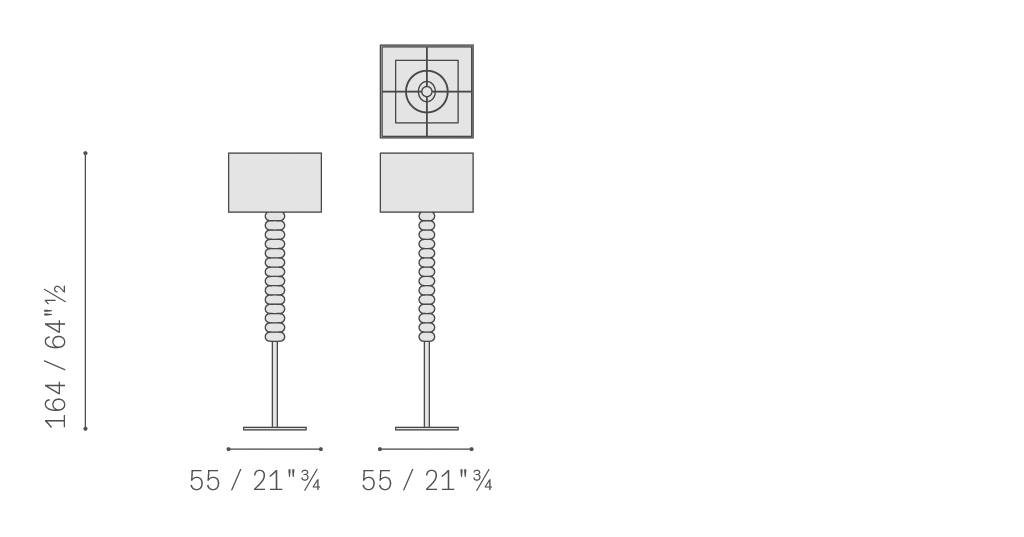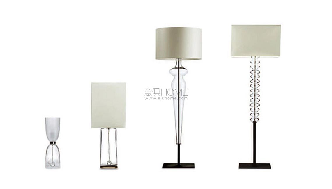 Alma燈具整體使用橫紋工藝玻璃制作,由兩個高度不同的玻璃鐘罩構成,構成一只發光的沙漏。Dido具有透明玻璃底座,Fede外部覆蓋漆面金屬,并配有透明玻璃珠串。Holly燈具采用漆面金屬底座,外部造型為透明玻璃,其特色在于柔軟纖細的線條,呈現出獨具風格的女性輪廓。Holly臺燈采用鍍色鋼底座,燈桿為磨砂不銹鋼,外部造型采用透明玻璃。底座和燈桿以及燈桿和燈槽之間的連接元素采用鍍色黃銅。Dido、Fede和Holly燈具配有雙層燈罩,外層為帆布,內層為PVC。