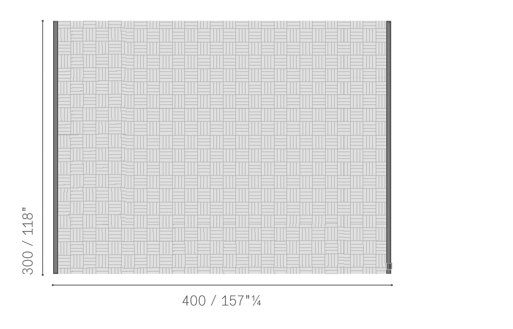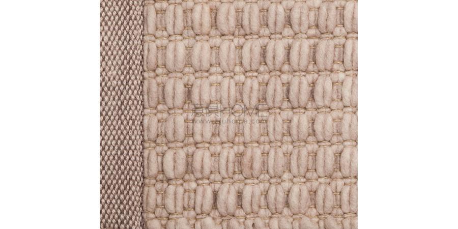 Pecan地毯表面經(jīng)過精心處理,兩個短邊采用40毫米的包邊,使用巴拿馬結(jié)構(gòu)面料,與地毯本身色調(diào)相同和構(gòu)成對比的線材交替使用。使用表面成分為100%羊毛,結(jié)構(gòu)+使用表面成分為40%黃麻和60%羊毛。總體厚度為12毫米,重量為2.