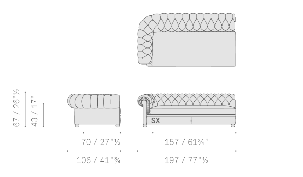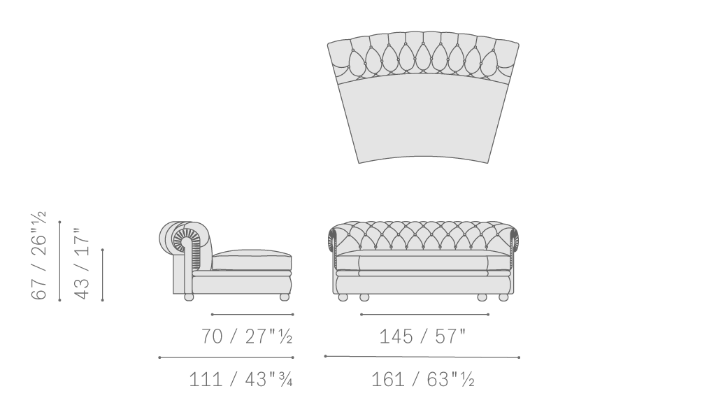 Chester Line沙發的支承結構采用陳年櫸木實木。坐墊、靠背和扶手處的彈簧結構使用手編雙錐形彈簧,架在黃麻帶上。靠背和扶手包墊中填充手工塑形植物纖維。鵝絨坐墊中添加聚氨酯泡沫穩定內芯。Pelle Frau?皮面與Poltrona Frau布藝構成不同搭配組合。經典圓形版本的支腳使用深色胡桃木色或黑色漆光櫸木;高12厘米,使用深色胡桃木色或黑色漆光櫸木;櫸木表面覆蓋軟皮,與沙發覆面搭配,或使用鍍色效果拉絲鋁板。