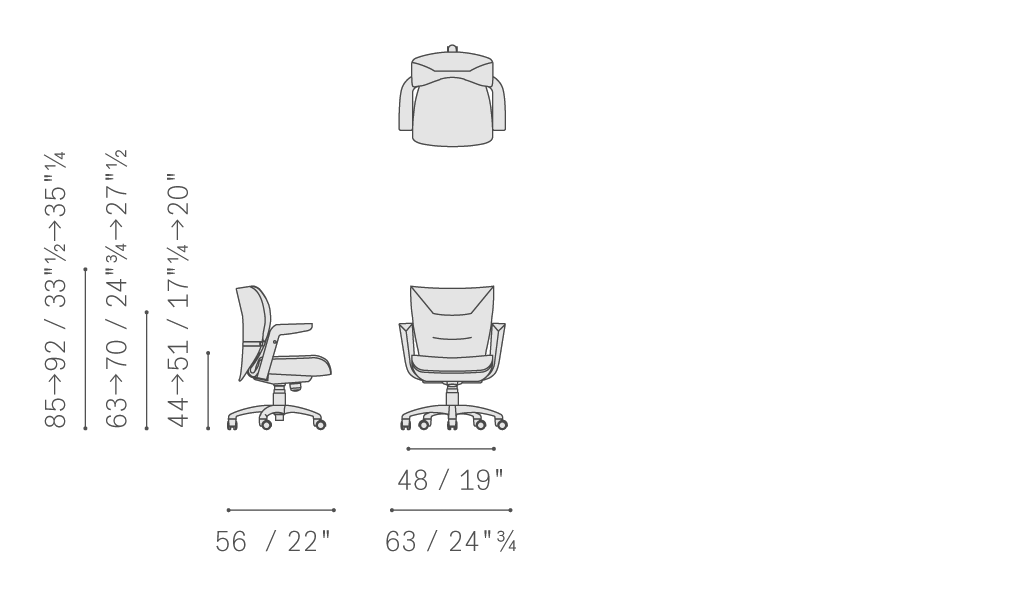 Brief小扶手椅采用鋼制結構。帶扶手版本中,可以將扶手高度調整延長6 cm,而靠背則總是可以調整升高+ 6 cm。Brief表面覆蓋Pelle Frau?軟皮,也可為雙色。扶手使用手工縫制覆層。五支腳底座可以使用黑色噴漆或拋光鋁,可以配備不同類型的輪子或滑軌。President和Executive款式配備“Syncron”系統,允許靠背和座椅振蕩,也可以縮小振蕩幅度。振蕩移動使得扶手椅能夠極為輕松的跟隨身體動作,適應身體移動,保證卓越的舒適度。Meeting版本使用旋轉機械系統,能夠回復到原始位置。