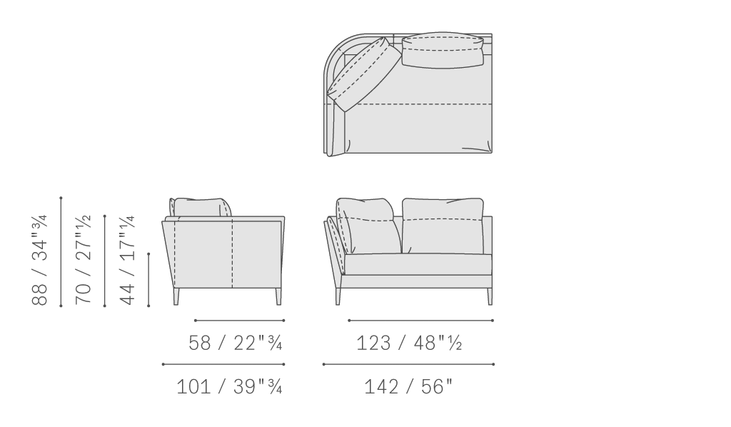 坐墊、靠背和扶手結構采用櫸木和陳年楊木,圍欄則使用樺木膠合板和中密度纖維板墊層。包墊中使用聚氨酯泡沫和聚酯棉。座墊彈簧結構使用松緊帶,填充鵝絨和聚酯絮絨,添加聚氨酯泡沫嵌塊。座椅和靠背靠墊填充鵝絨,添加泡沫穩定嵌塊。支腳為黑色漆繪櫸木或鍍色鋼表面處理鋁材。