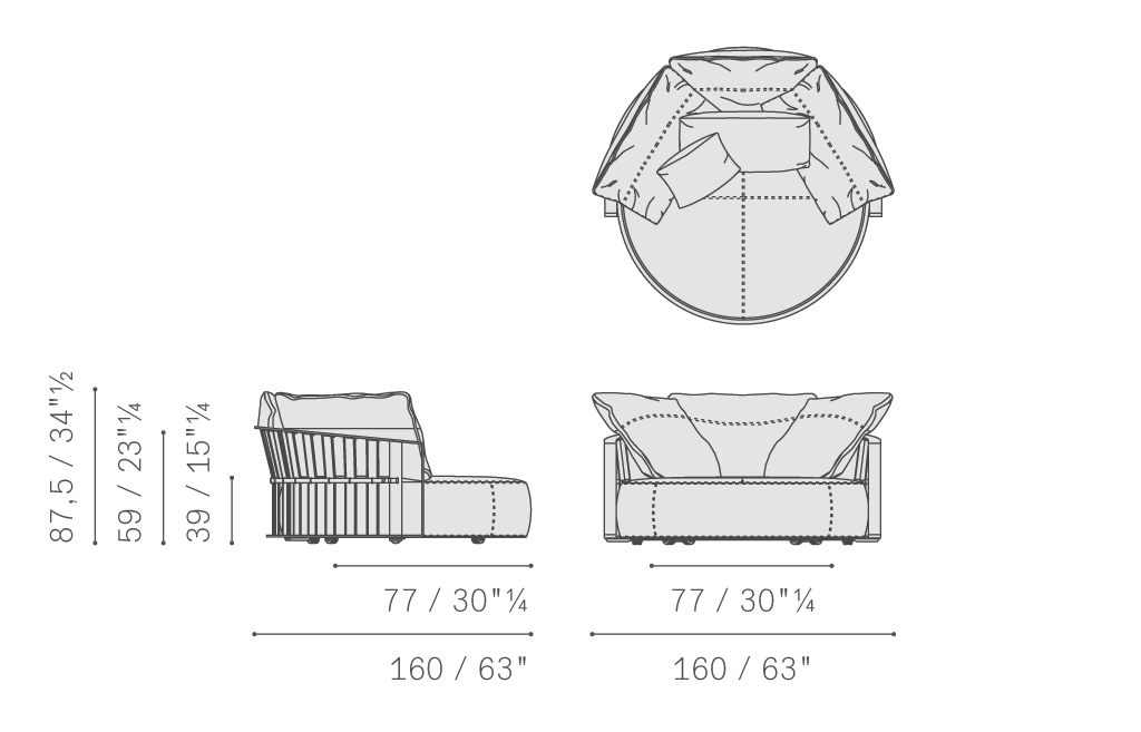 憑借原創圓形形狀、包容而寬大的空間,Scarlett充滿誘惑和征服感,總是能夠成為眾所矚目的焦點。Scarlett是沙發、臥榻、搖籃、庇護所以及每一種家居環境的中心。這一設計充分反映喜愛將建筑幾何與完滿柔軟輪廓相搭配的Jean-Marie Massaud精髓。