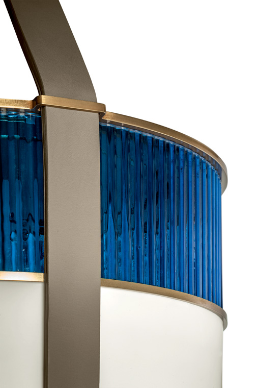 Xi燈具采用吹制玻璃和鞣皮制作,如燈籠般被空間呵護。發光體由兩個吹制玻璃元素構成。上半部分具有特殊的規則而透明羅紋表面,染上琥珀、綠寶石、紅寶石或月光石色。發光體下半部分采用珍珠表面處理,令光線溫暖而分散。這些部件由威尼斯玻璃大師使用彩色玻璃膏吹制而成,每一件均獨一無二。玻璃藝術加工會導致著色深淺差異以及小氣泡,這是產品價值所在,令每一件獨一無二、絕不重復。