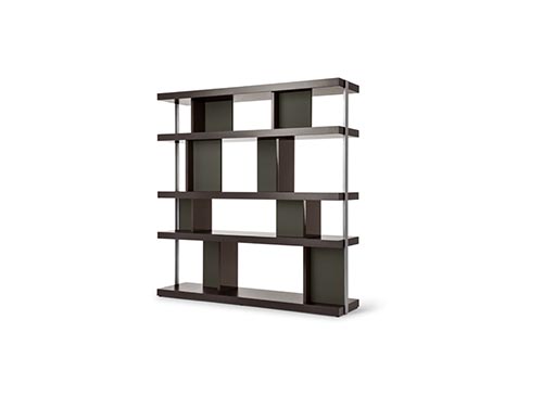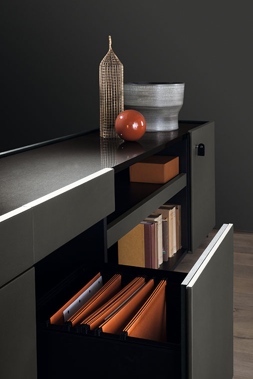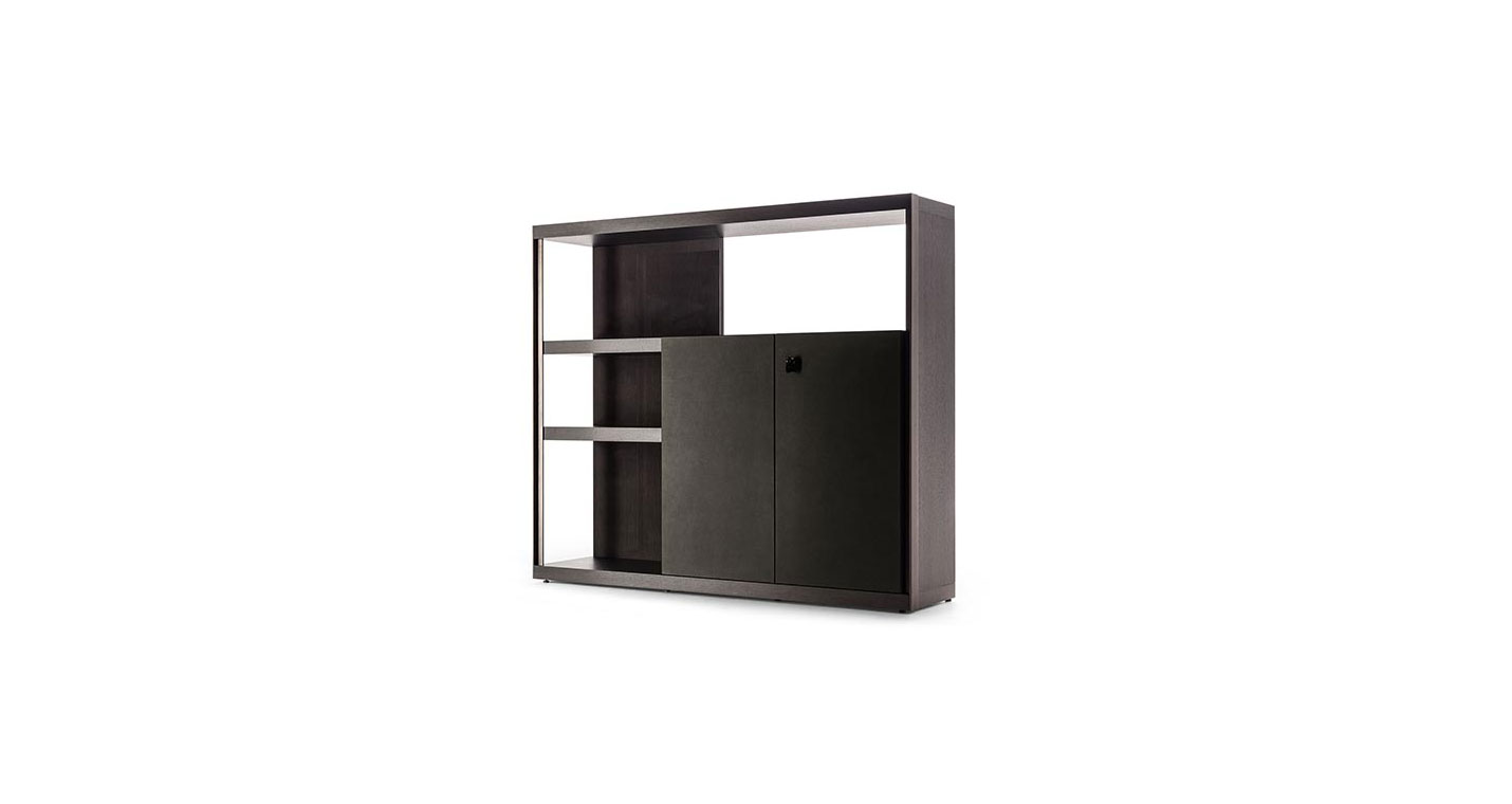 板和帶門板的隔槽交替。既可以沿墻壁擺放,也可以置于房間中央,還可以用于定義、劃分和組織空間。Jobs High Cabinet(高柜)和整個產品系列相同,配備精美的表面修飾和材料。垂直支柱使用汞色鋼材,采用特色T型截面,是Jobs各款家具的特色所在。中密度纖維板小門板覆蓋Pelle Frau?軟皮。所有其他元素、架板、隔槽和背板也是用相同的材料:鉛色或煙草色拋光貼面與典雅的拋光和啞光表面交替。