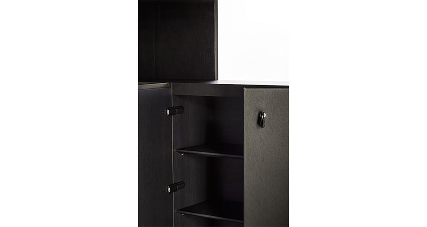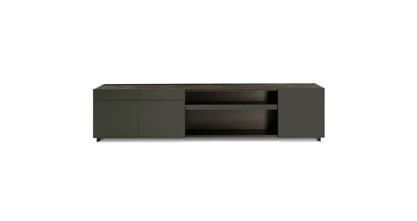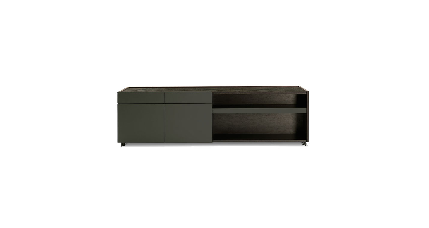 Jobs Low Cabinet(低柜)結構采用中密度木質纖維板,鑲貼鉛色或煙草色拋光表面處理無梗花櫟木,頂板則使用啞光表面處理。底座使用汞色噴漆軋光鋼,搭配可調節底腳和中心連接橫撐,黑色噴漆,采用防劃表面處理。Jobs Low Cabinet(低柜)后側配有可翻轉門板,門后是一個內部小隔槽,用于接出纜線,通過沿整個表面橫向排列的溝槽從地板處一直延伸到頂板。Jobs Low Cabinet(低柜)分為兩種長度,分別為230 cm和284 cm,均采用兩種不同的翻蓋門和抽屜布置。