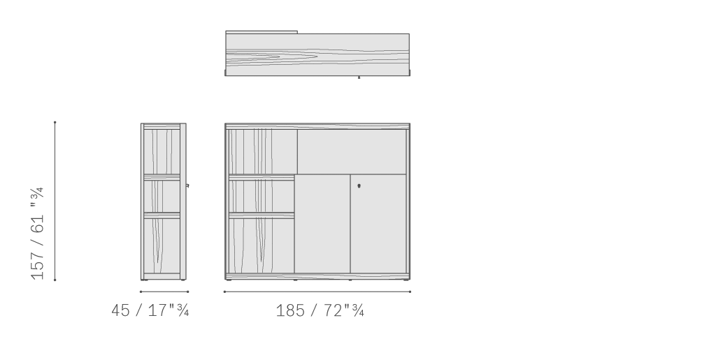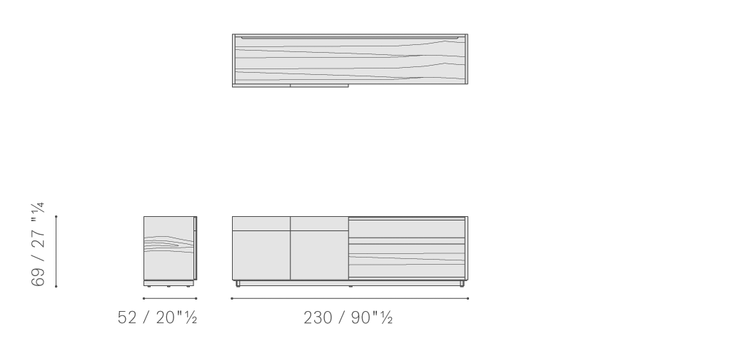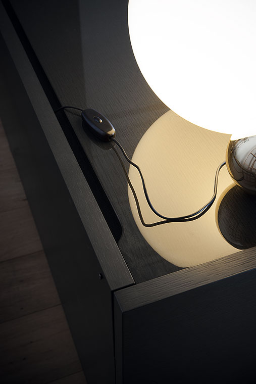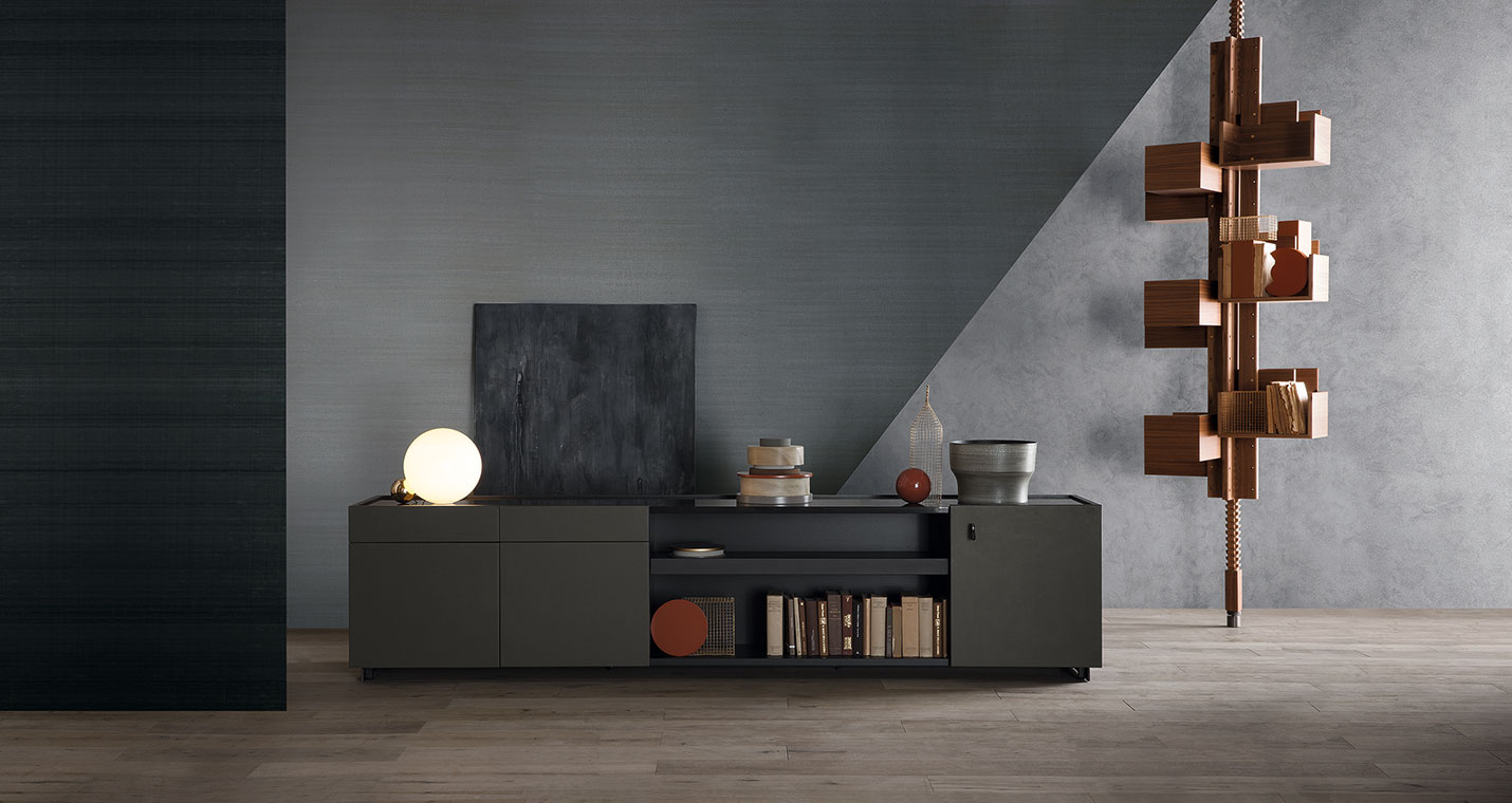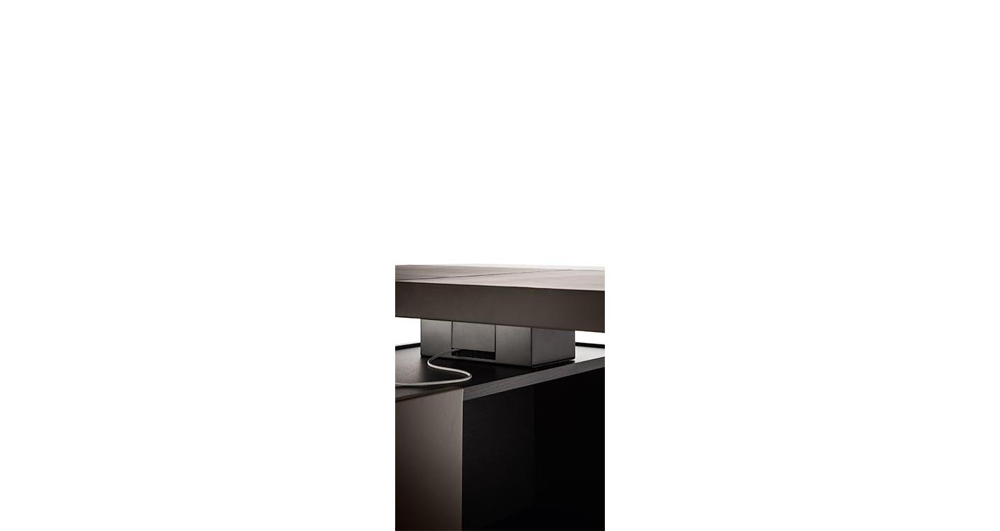 Jobs Low Cabinet(低柜)結構采用中密度木質纖維板,鑲貼鉛色或煙草色拋光表面處理無梗花櫟木,頂板則使用啞光表面處理。底座使用汞色噴漆軋光鋼,搭配可調節底腳和中心連接橫撐,黑色噴漆,采用防劃表面處理。Jobs Low Cabinet(低柜)后側配有可翻轉門板,門后是一個內部小隔槽,用于接出纜線,通過沿整個表面橫向排列的溝槽從地板處一直延伸到頂板。Jobs Low Cabinet(低柜)分為兩種長度,分別為230 cm和284 cm,均采用兩種不同的翻蓋門和抽屜布置。