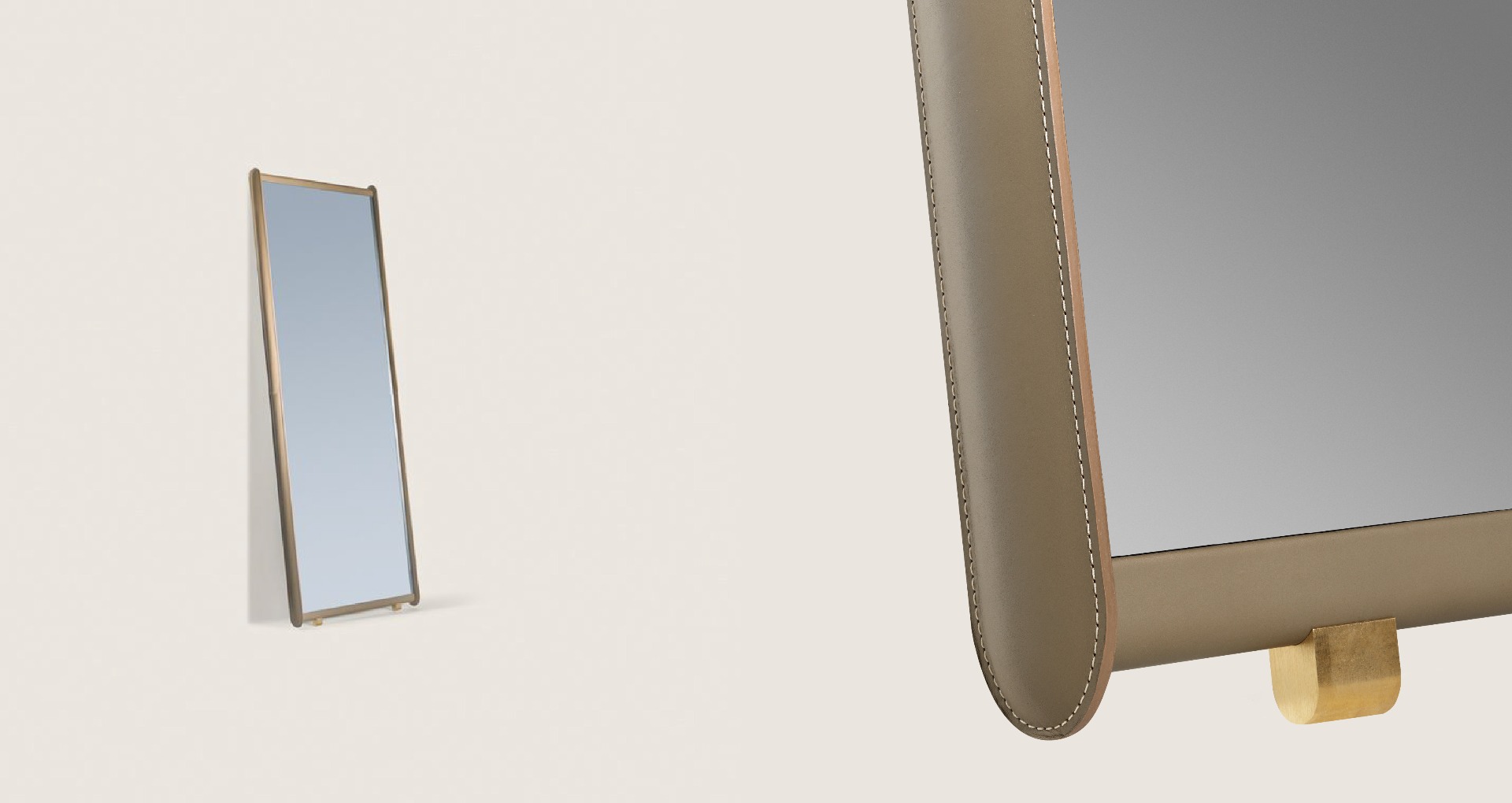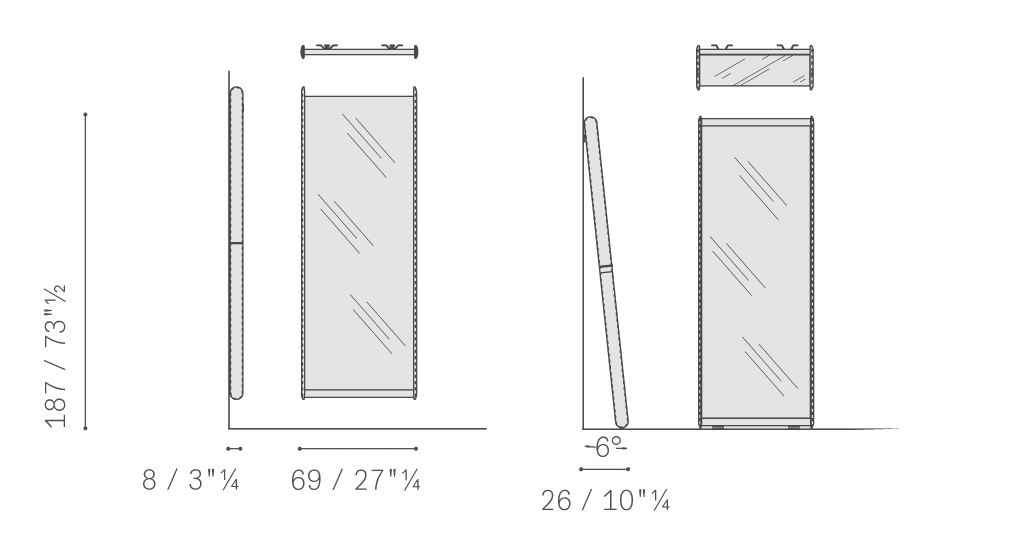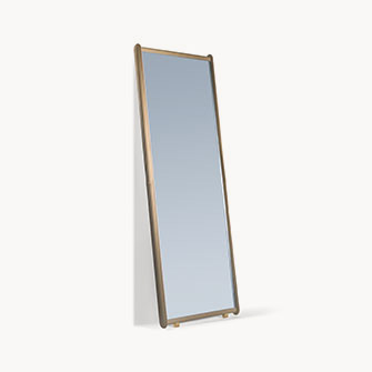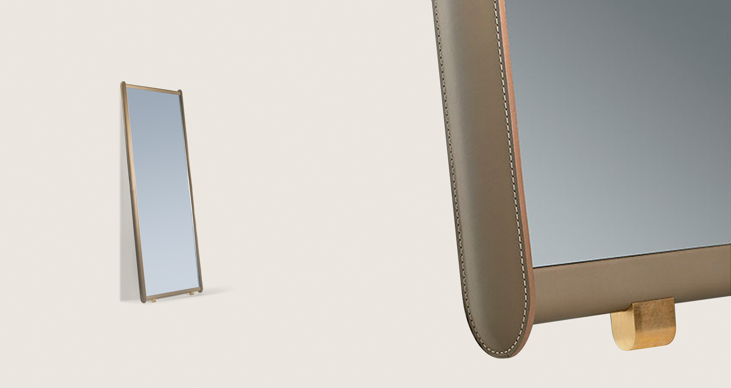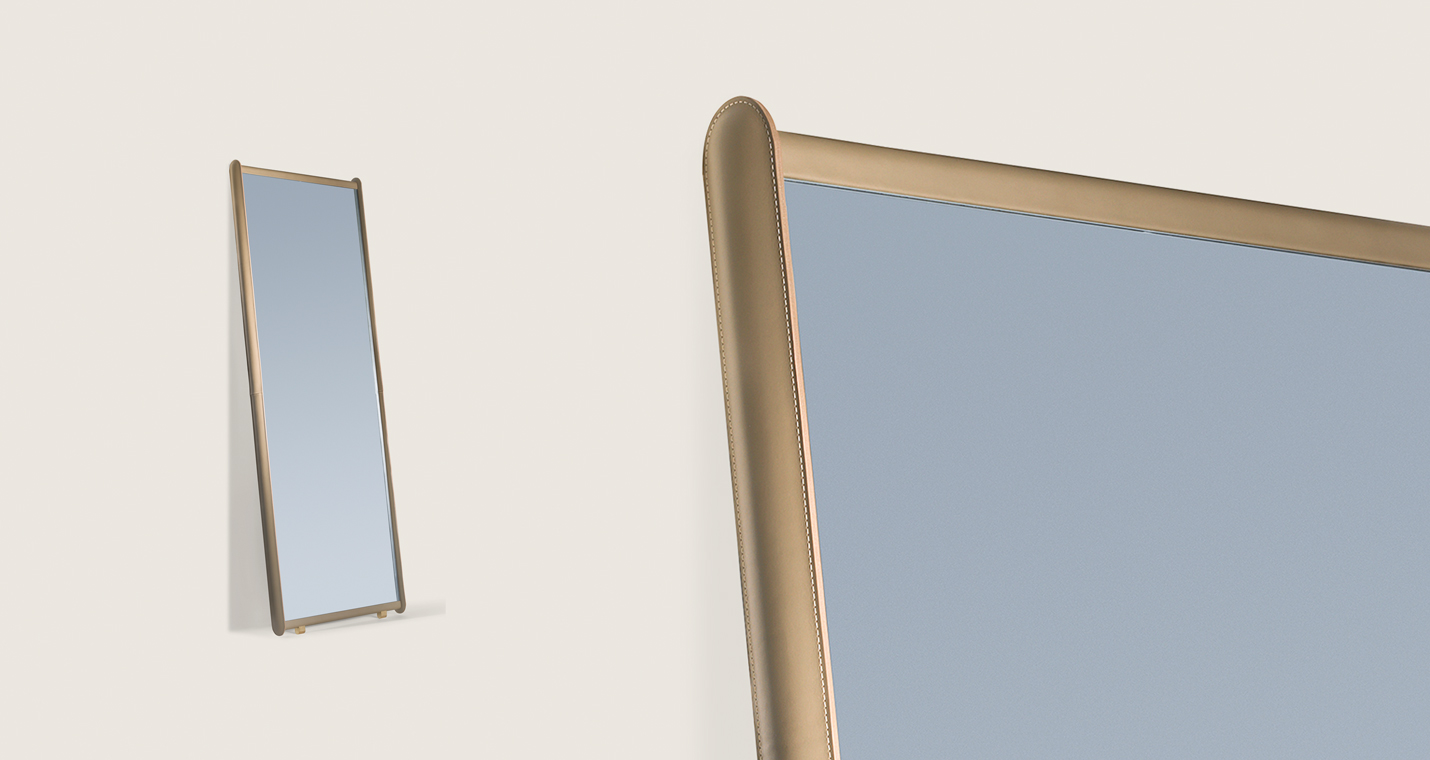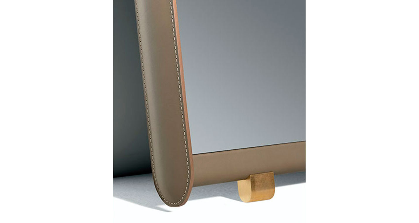 Dorian鏡子支撐結(jié)構(gòu)由楊木膠合板構(gòu)成,邊框使用櫸木實木。面板后側(cè)貼有黑色提花帆布。邊框覆蓋皮革,裝飾手工精湛的同色深淺或?qū)Ρ壬樐_。Dorian兩側(cè)略微填充,手感舒適柔軟。鏡子本身為5毫米厚的銀色水晶。內(nèi)表面貼有防裂安全膜。Dorian鏡子配有全套配件,可以擺放在地面上或固定在墻壁上。