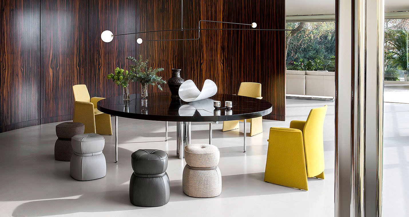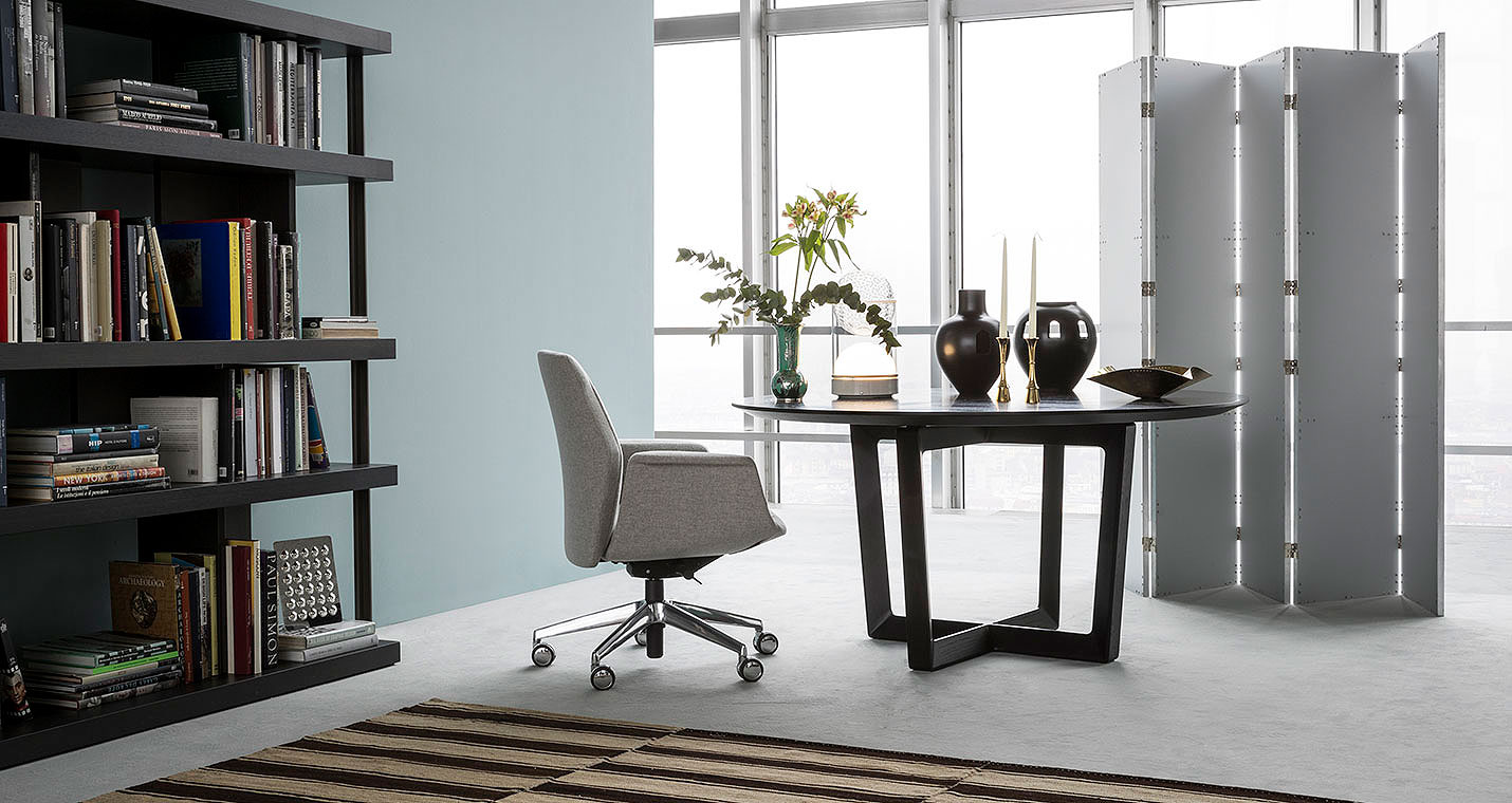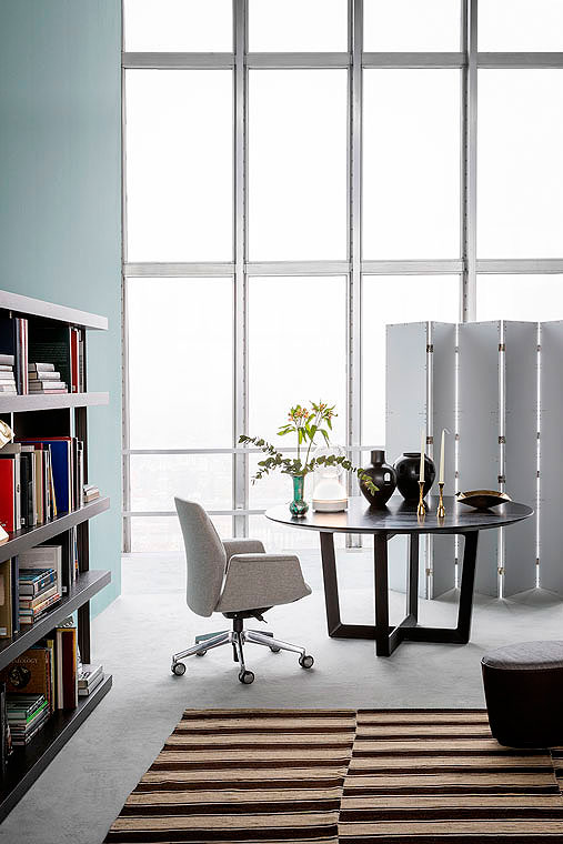 Downtown系列變得更加全面而靈活多樣。除了辦公室系列的President、Executive、Managerial、Meeting和Visitor款式之外,Jean-Marie Massaud設計了三款全新DownTown Conference小扶手椅:憑借四椅腿底座或滑軌和橋式底座旋轉。既適合工作空間,也適合家庭環境。加工、形狀、材料共同展示私密且個性的典雅。工作空間變成生活和居住的場所。