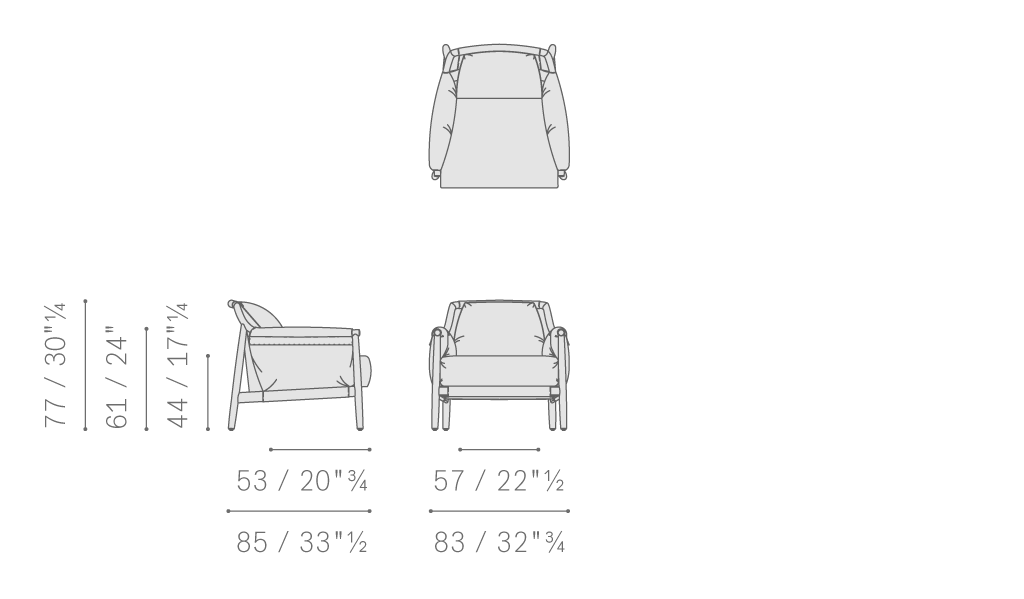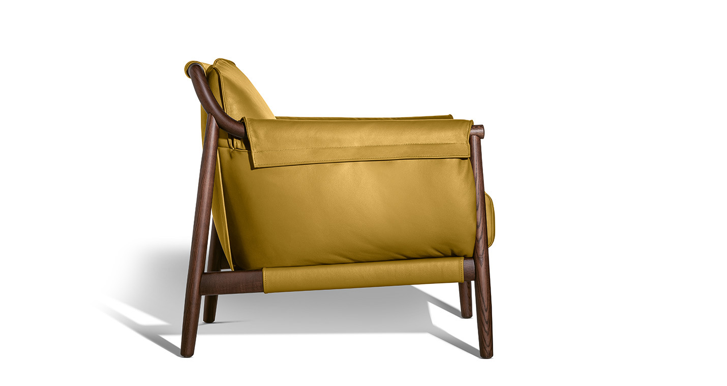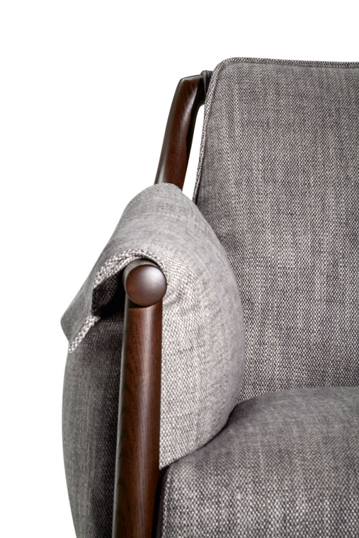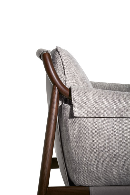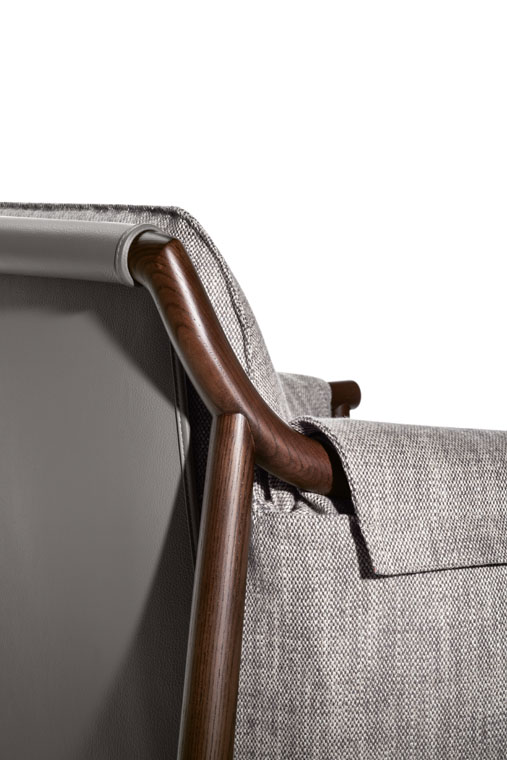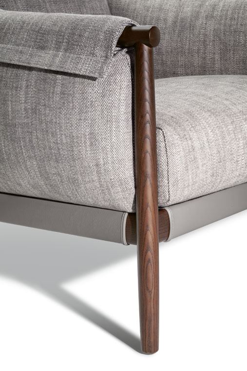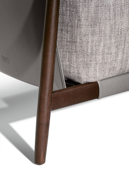 結(jié)構(gòu)使用摩卡色或雞翅木色白蠟?zāi)緦嵞尽D静脑诳梢姴糠值臋M截面為圓形,下部連接橫梁處橫截面為橢圓形。沙發(fā)椅墊材支撐包繞木制結(jié)構(gòu),由Pelle Frau?軟皮制成。座板下方使用支撐技術(shù)面料作為彈簧結(jié)構(gòu)。靠背和座板包墊填充聚氨酯泡沫和聚酯棉,而扶手則內(nèi)部填充聚酯棉。靠背和扶手軟墊罩縫成整體,坐墊套單獨,掛在椅罩其余部分上。軟墊通過隱藏拉鏈和按扣固定在結(jié)構(gòu)上。軟墊表面也可覆蓋Pelle Frau?軟皮和布藝。在這兩種情況下,外套均可拆。可以單獨購買額外外套。