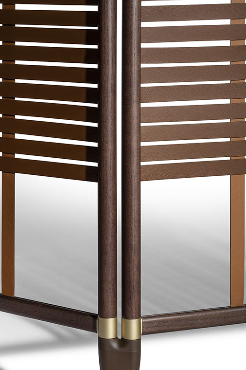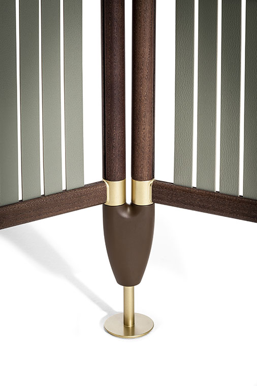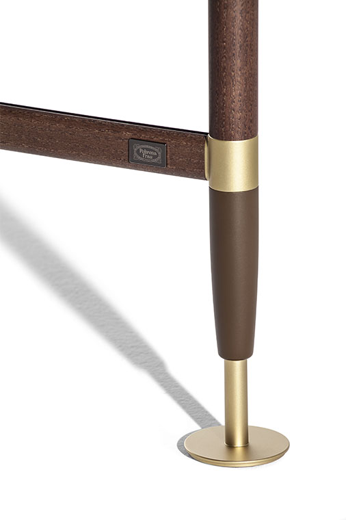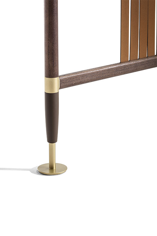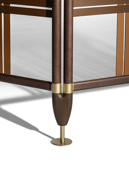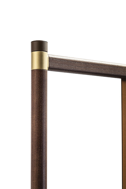 結(jié)構(gòu)採(cǎi)用摩卡色白蠟?zāi)颈砻嫘ЧN面鋁管制成。縱橫管之間的連接採(cǎi)用經(jīng)過(guò)啞光黃銅表面處理的金屬元件。下部錐形底腳也採(cǎi)用金屬,表面噴漆。結(jié)構(gòu)支撐在啞光黃銅飾面金屬底腳上。