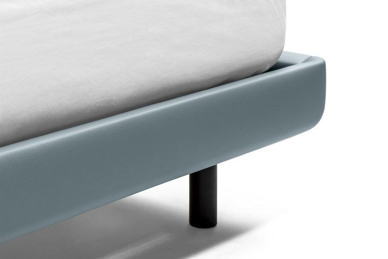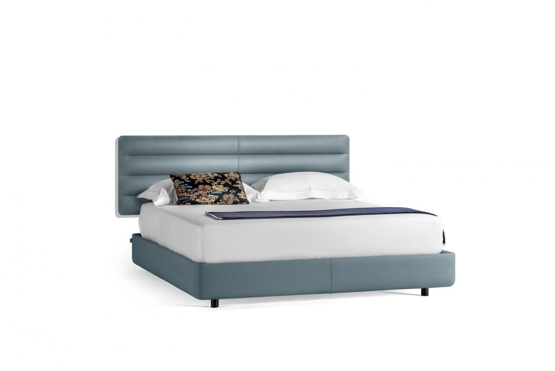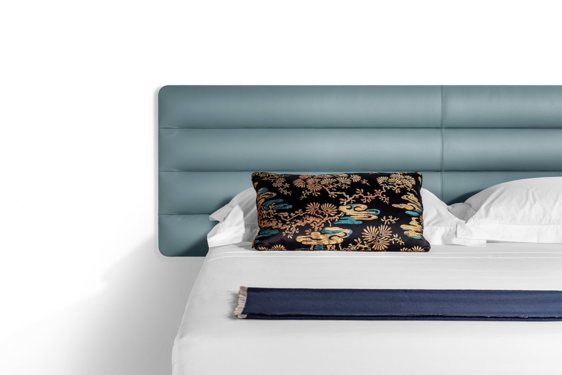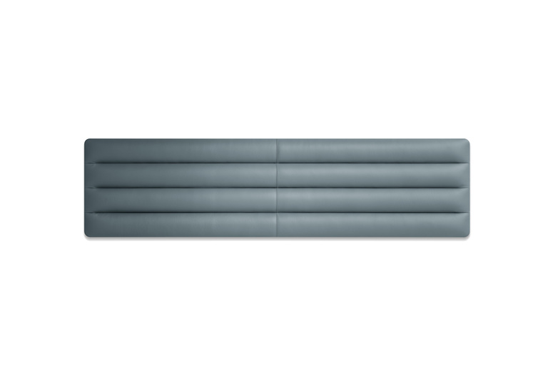 The Ferdinandea headboard features a birch plywood frame coated with a layer of polyurethane foam and polyester wadding and upholstered in Pelle Frau, with delicate matching tone-on-tone stitching that makes up a geometric pattern available in two variations: horizontal or vertical. The back of the Ferdinandea headboard is covered in black canvas and can be anchored to the wall using a bayonet fastening system made of matte black painted metal. Designed to be combined in complete freedom with the different Ferdinandea bed variations, the headboard is available in different lengths.