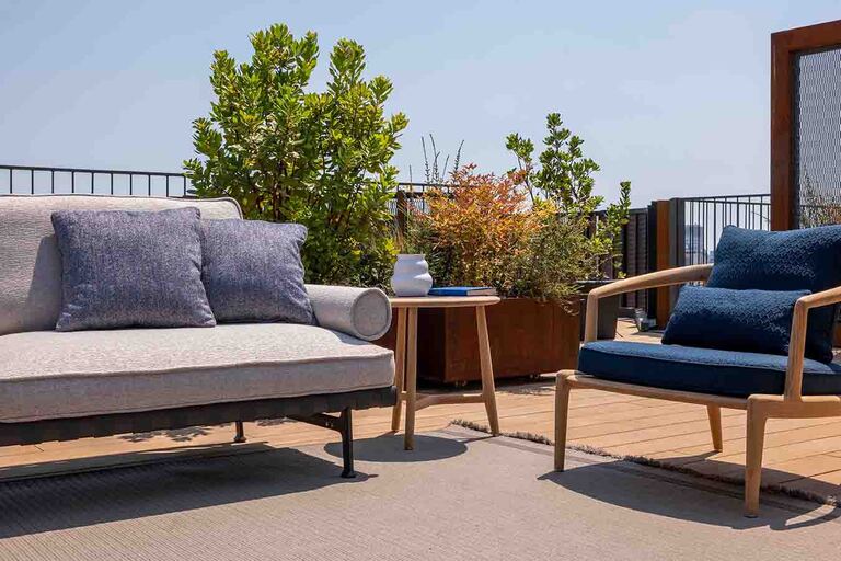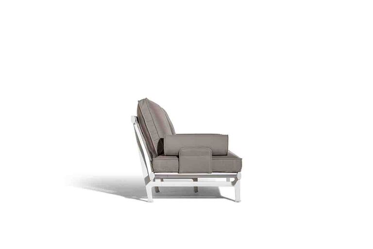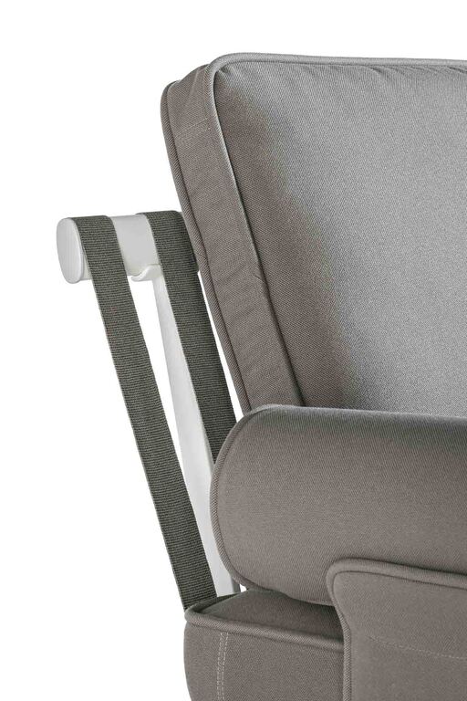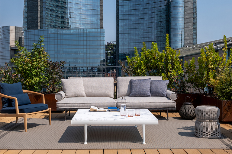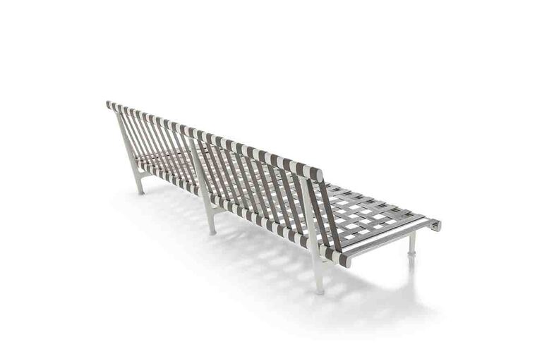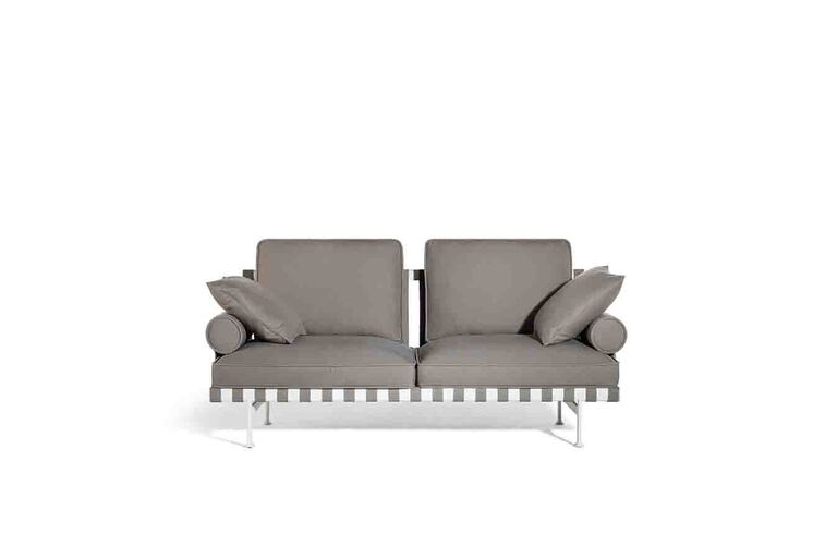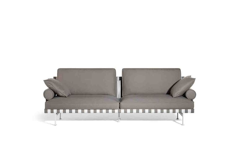Generously sized, it features a simple design that interprets two archetypes of outdoor furniture: metal and woven belts. The polypropylene fibre elastic belts punctuate the surface of the seat and backrest with full and empty spaces, creating an image of lightness and transparency. That lightness is also emphasised by the cast aluminium support feet, which make the sofa appear as thought it is suspended off the ground. The supporting structure, in extruded aluminium, is made up of three longitudinal beams with an oval section that form an "L", wrapped in the motif created by the belts. The cushions are made up of large "mattresses", emphasised by pronounced piping that draws their silhouette. They are placed directly on the woven structure, without concealing it. The padding is double-density draining polyurethane foam, designed especially for outdoor furnishings.
