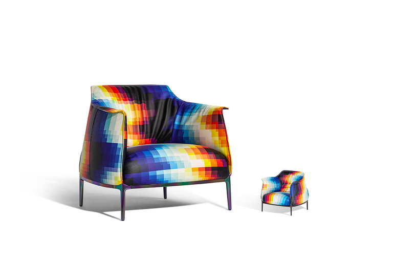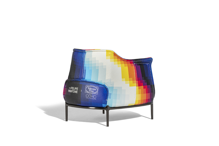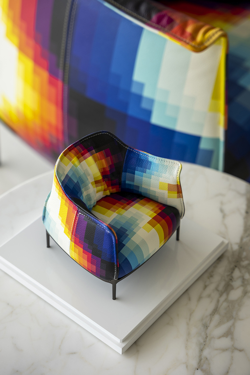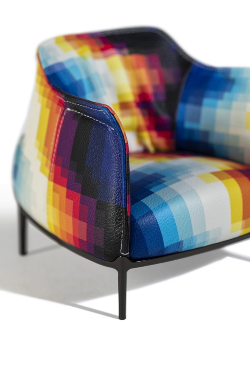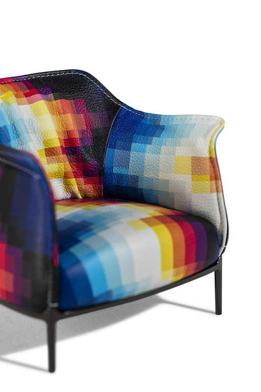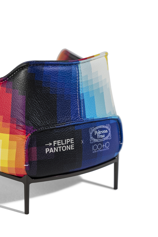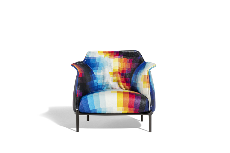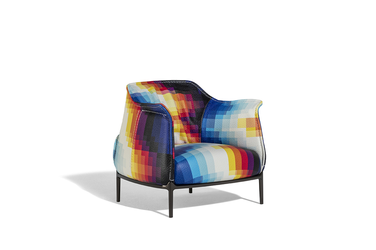 It is distinguished by the pleasantly textured leather upholstery and the folded armrests that resemble a shirt collar. The upholstery is in Pelle Frau? ColorSphere? Impact Less, the innovative leather tanned with sustainable components and without the use of chrome for a reduced environmental impact.