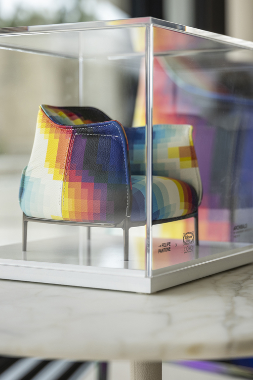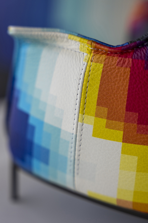 To emphasize the chromatic vibe of the surface, the base, characterised by four die-cast aluminium feet and a steel frame, has a multicolour chrome finish: a special iridescent paint treatment in colours and light, which gives a brilliant purplish-blue shade.