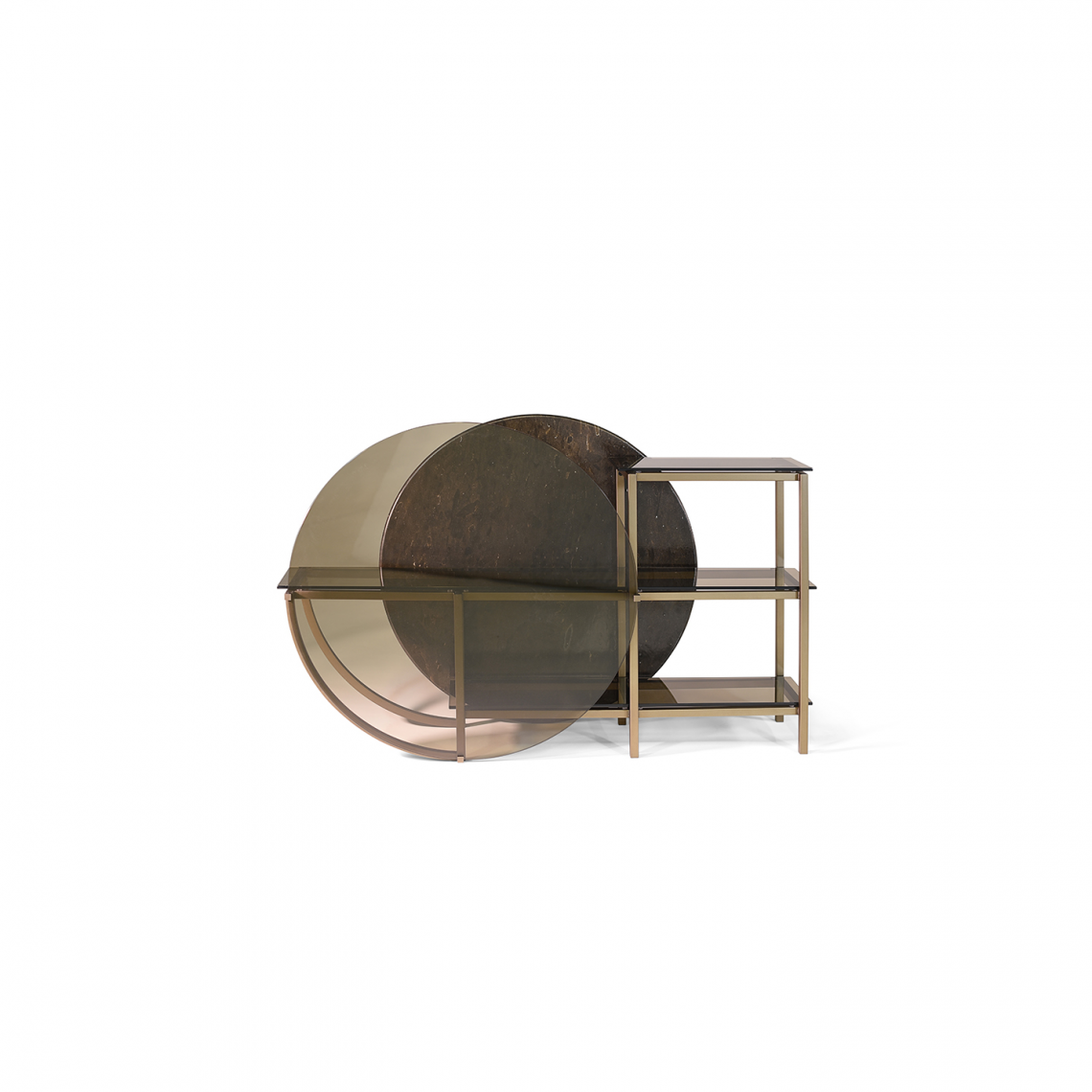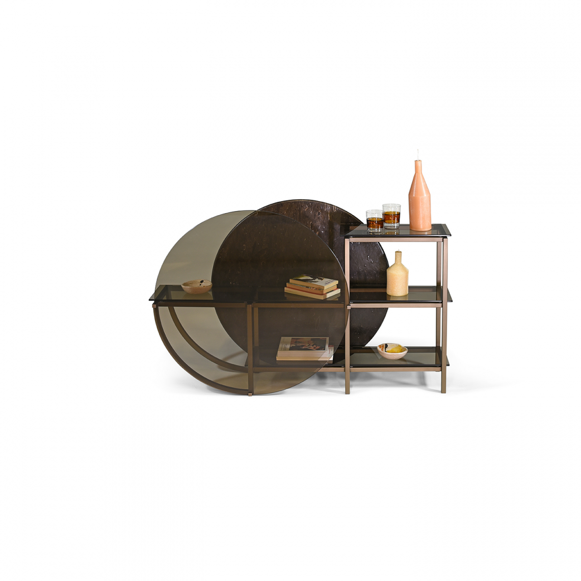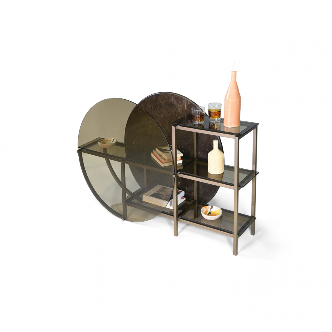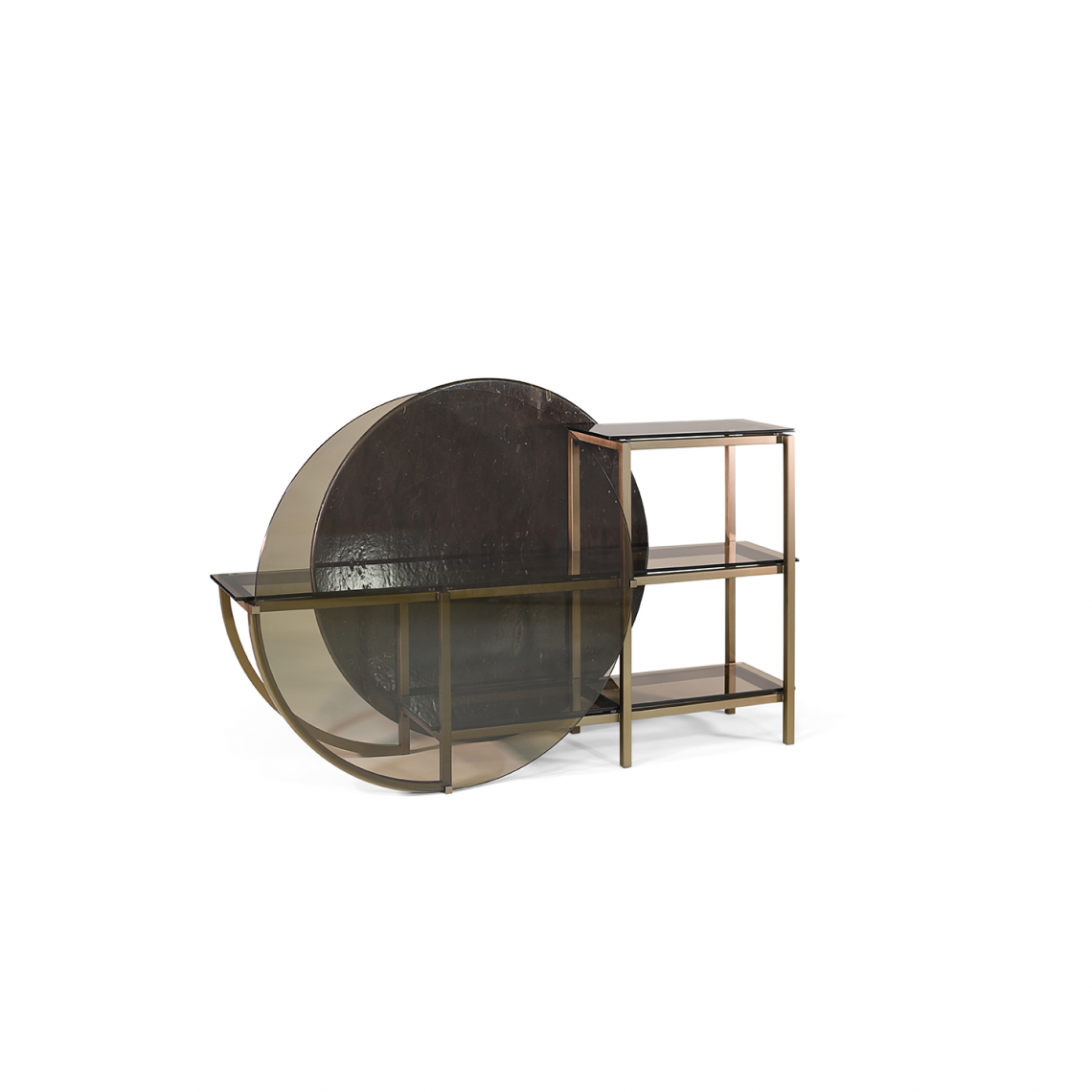 Struttura in metallo finitura bronze shadow opaco, con ripiani e disco anteriore in vetro temperato col. Avana (sp. 6 mm). Il disco posteriore -disponibile in pietra pece oppure in vetrofuso ondulato retrolaccato col. Avana- definisce i confini tridimensionali di questo oggetto multiforme