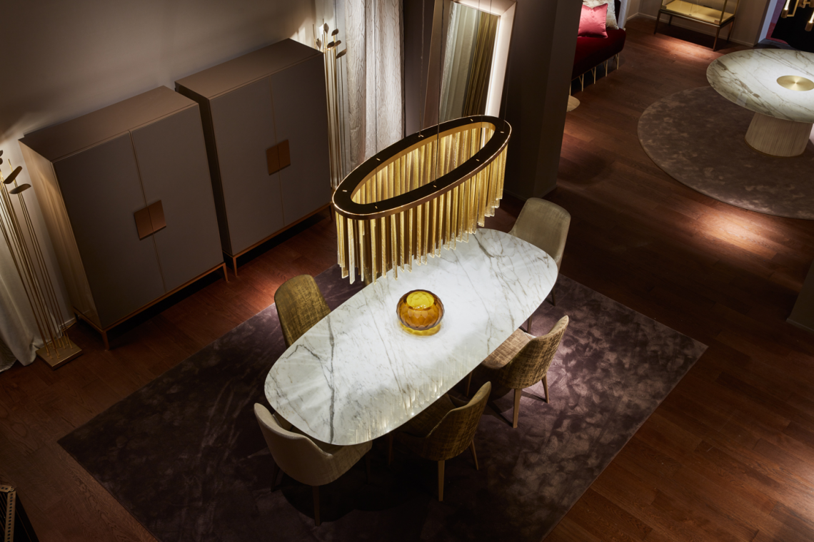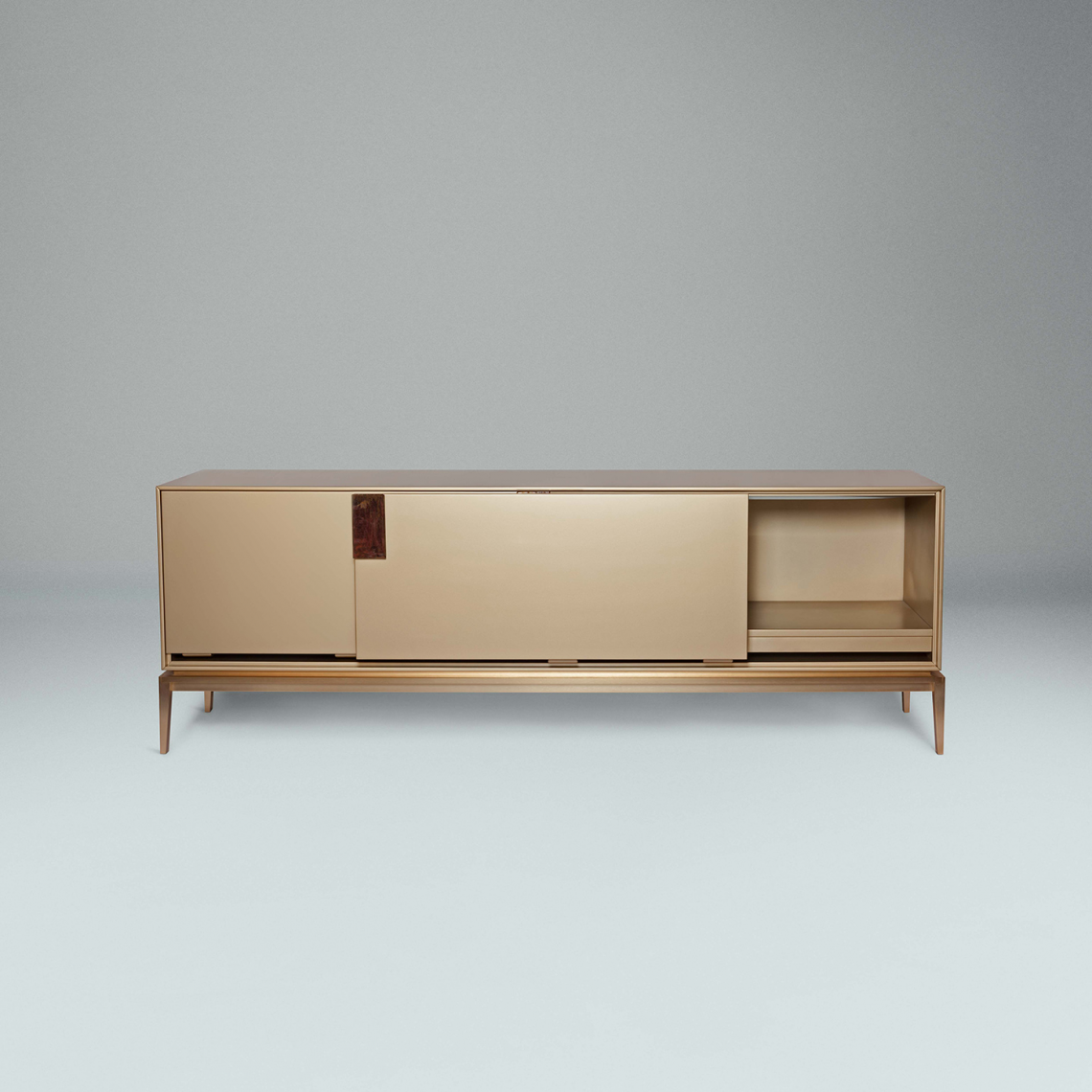 L’interno si presenta laccato opaco in tinta, con schiena rivestita in vetro specchiato satinato col. bronzo e organizzato con opportuni 4 ripiani in cristallo oppure 3 cassetti, 1 ripiano verniciato lucido 100 gloss e 1 ripiano in cristallo. Luce led interna.