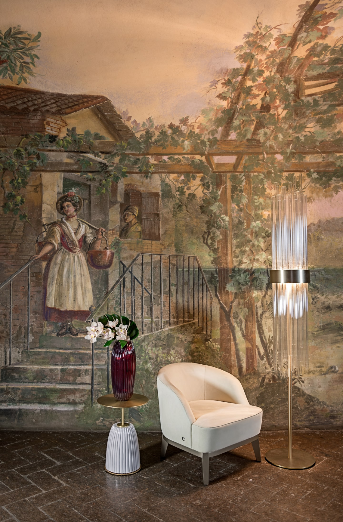 Tavolini scultorei che abbinano, in forme diverse marmo, metallo verniciato oro opaco e la ceramica artigianale finemente lavorata a Vietri.