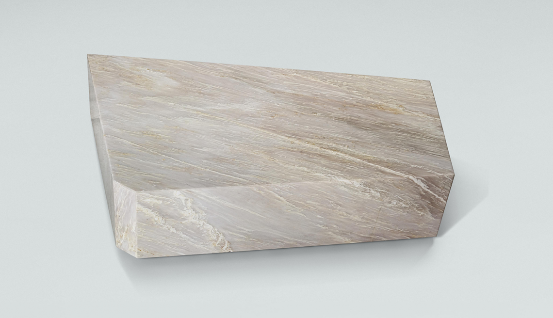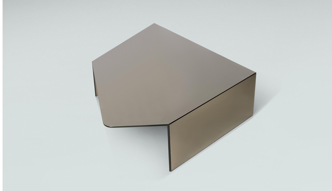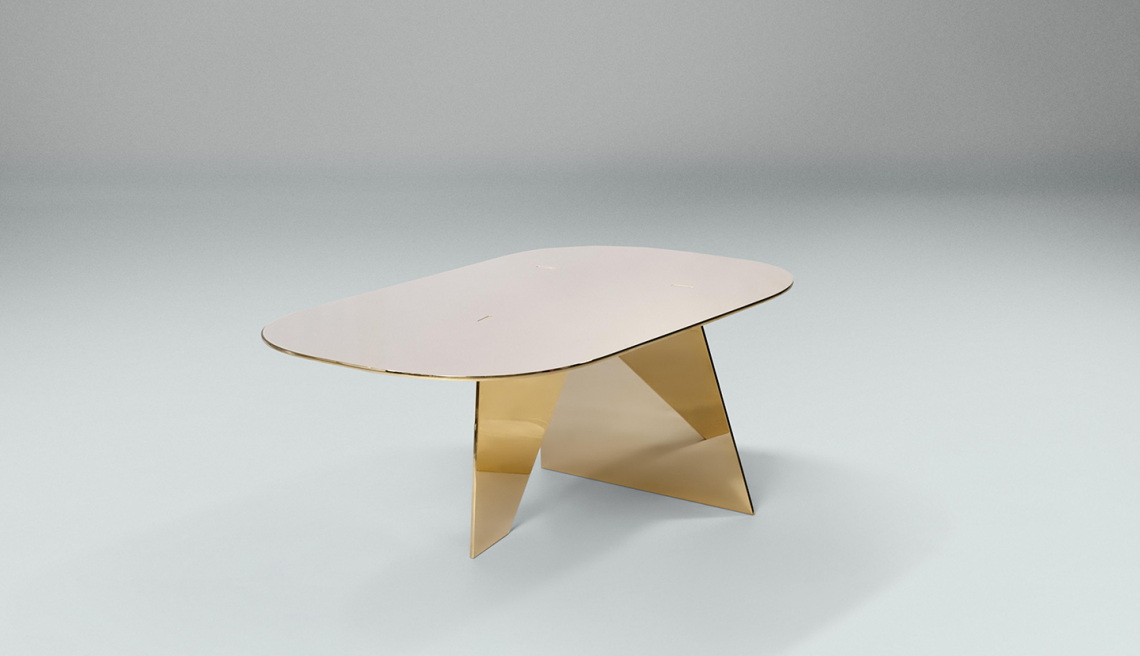 SIDE – Tavolino realizzato con 3 lastre in materiali diversi – marmo Rosa Egeo, metallo con finitura oro lucido, vetro color Avana – combinati tra loro e posizionati ad incastro.