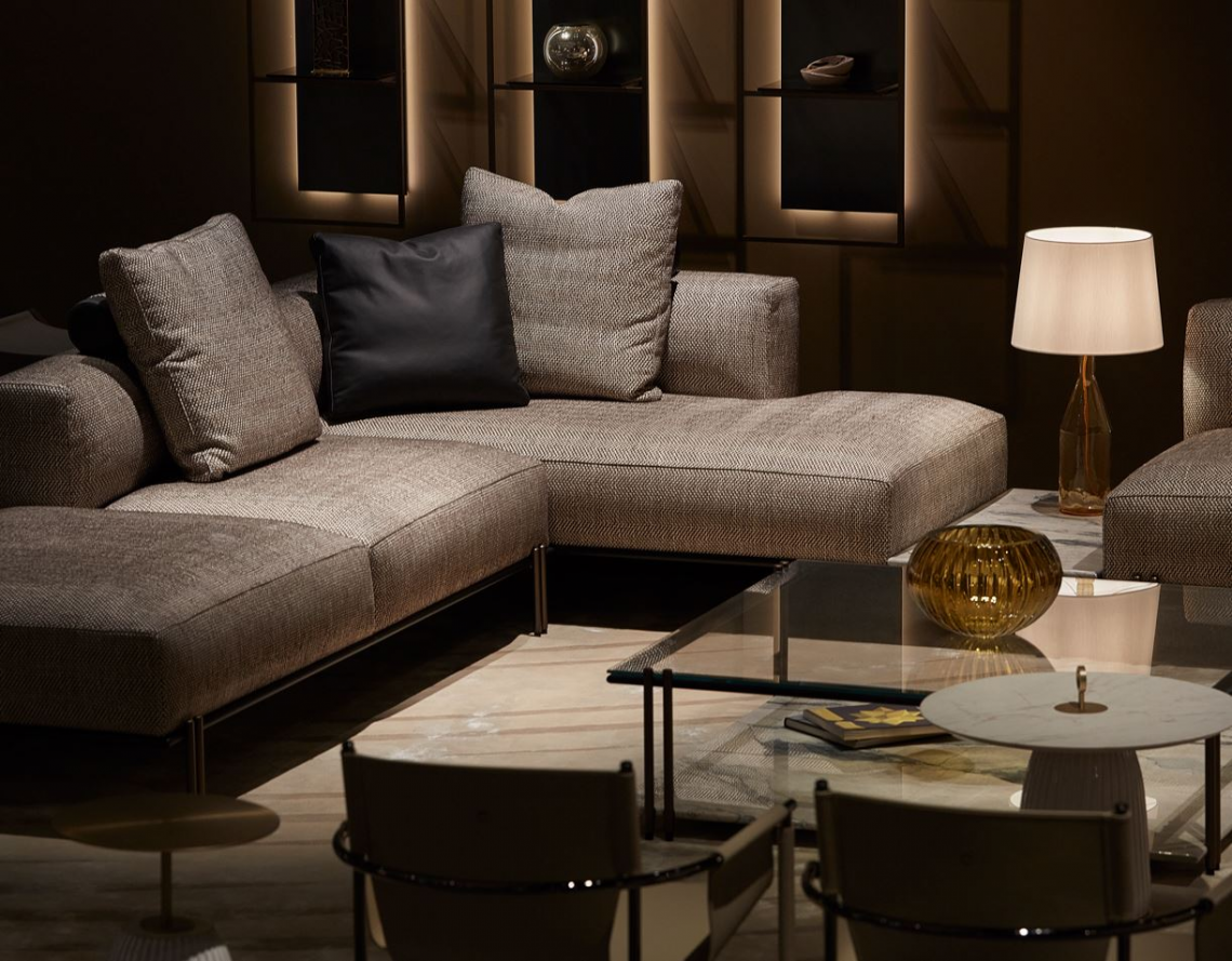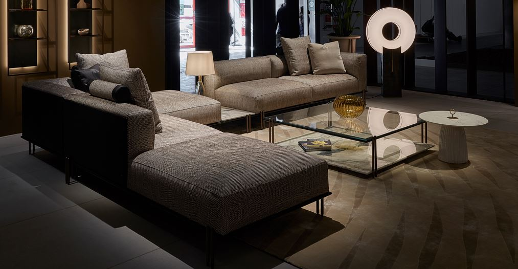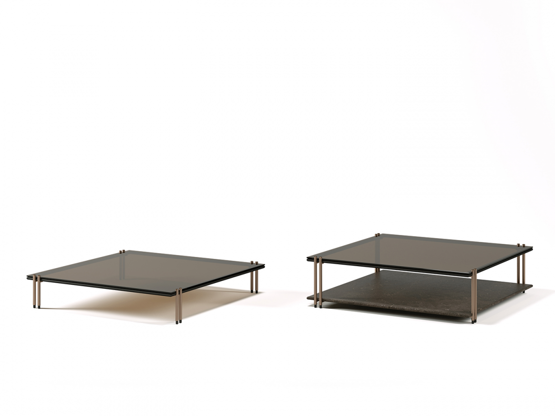 La base in metallo finitura nero opaco, con doppi piedini in metallo finitura bronzo opaco, evidenzia la leggerezza complessiva del progetto, sostenendo il ripiano superiore in vetro colore Avana e quello inferiore in pietra Pece. In alternativa, il tavolino può essere configurato con il vetro trasparente extra-chiaro ed il ripiano inferiore in marmo Lunar Breccia.