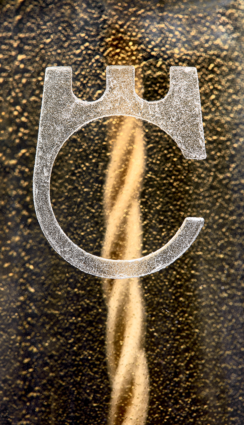 La base è a forma di goccia, realizzata in cristallo con all’interno povere d’oro 24 KT in sospensione, e paralume in tessuto realizzato artigianalmente.