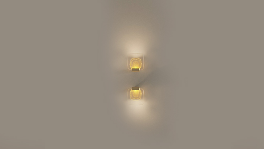 L’elemento, realizzato in vetro di murano con un triplo passaggio di foglia d’oro 24Kt, è agganciato a un corpo metallico in finitura oro satinato che alloggia al suo interno la sorgente led e il proprio driver.