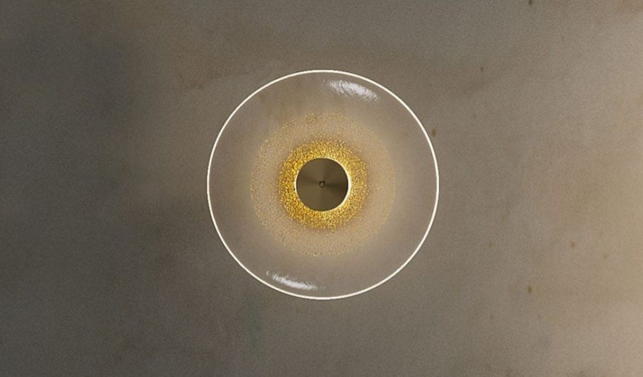 Il vetro, che riflette la luce e la diffonde nell’ambiente, è incastonato in un disco di metallo finitura oro opaco satinato e sostenuto a parete da un rosone nelle medesima finitura, al cui interno è alloggiato il driver.