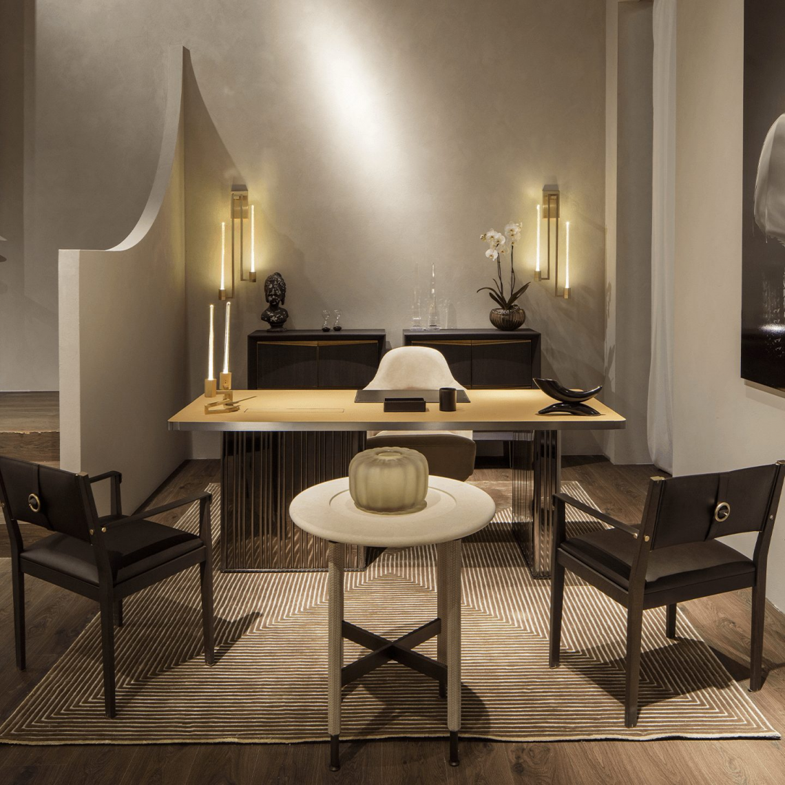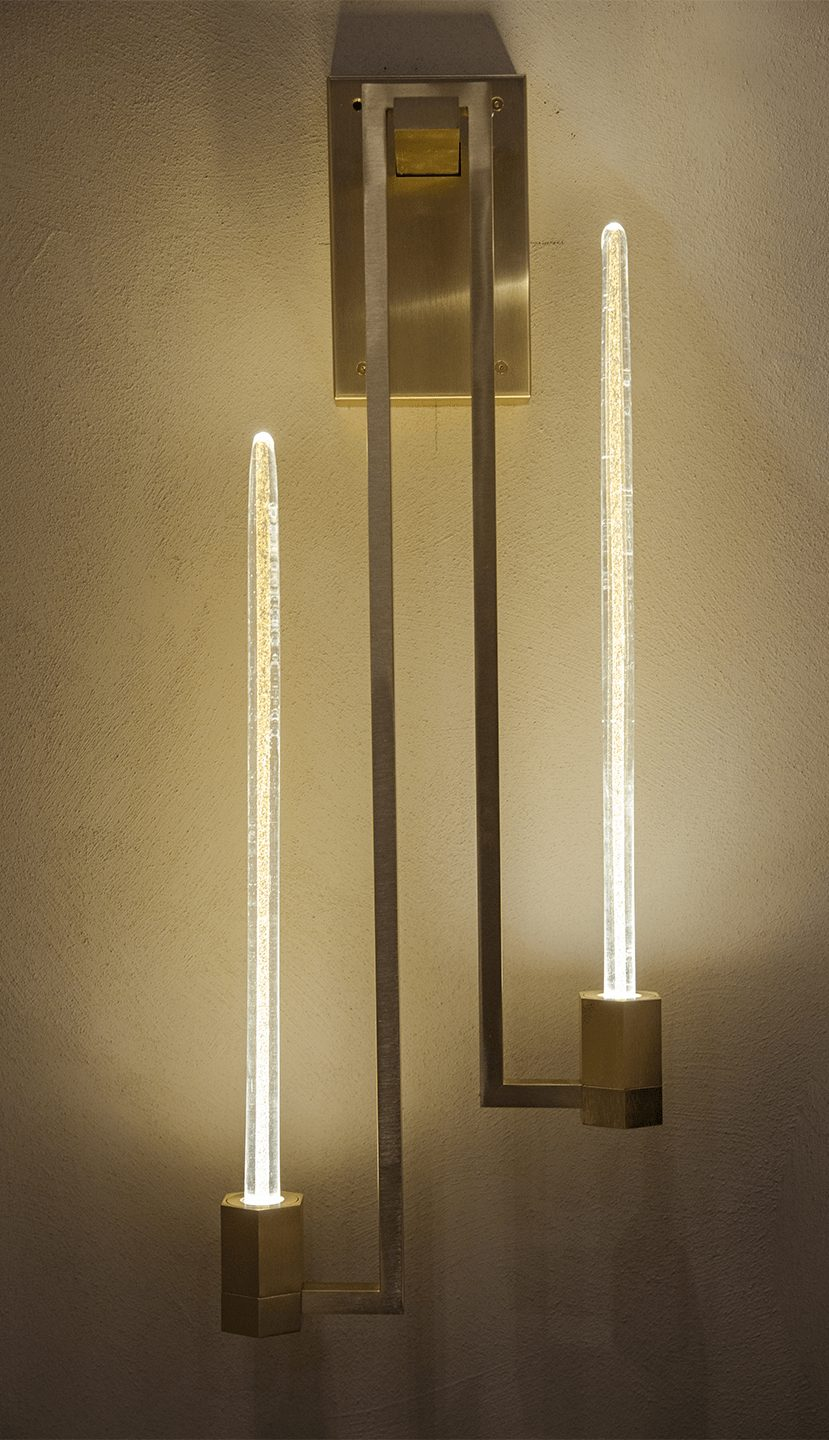 Della linea fa parte anche questa versione applique, realizzata con due bracci in ottone fiitura oro opaco che sorreggono elementi in vetro di Murano con foglia d’oro 24 KT all’interno, in dispersione.
